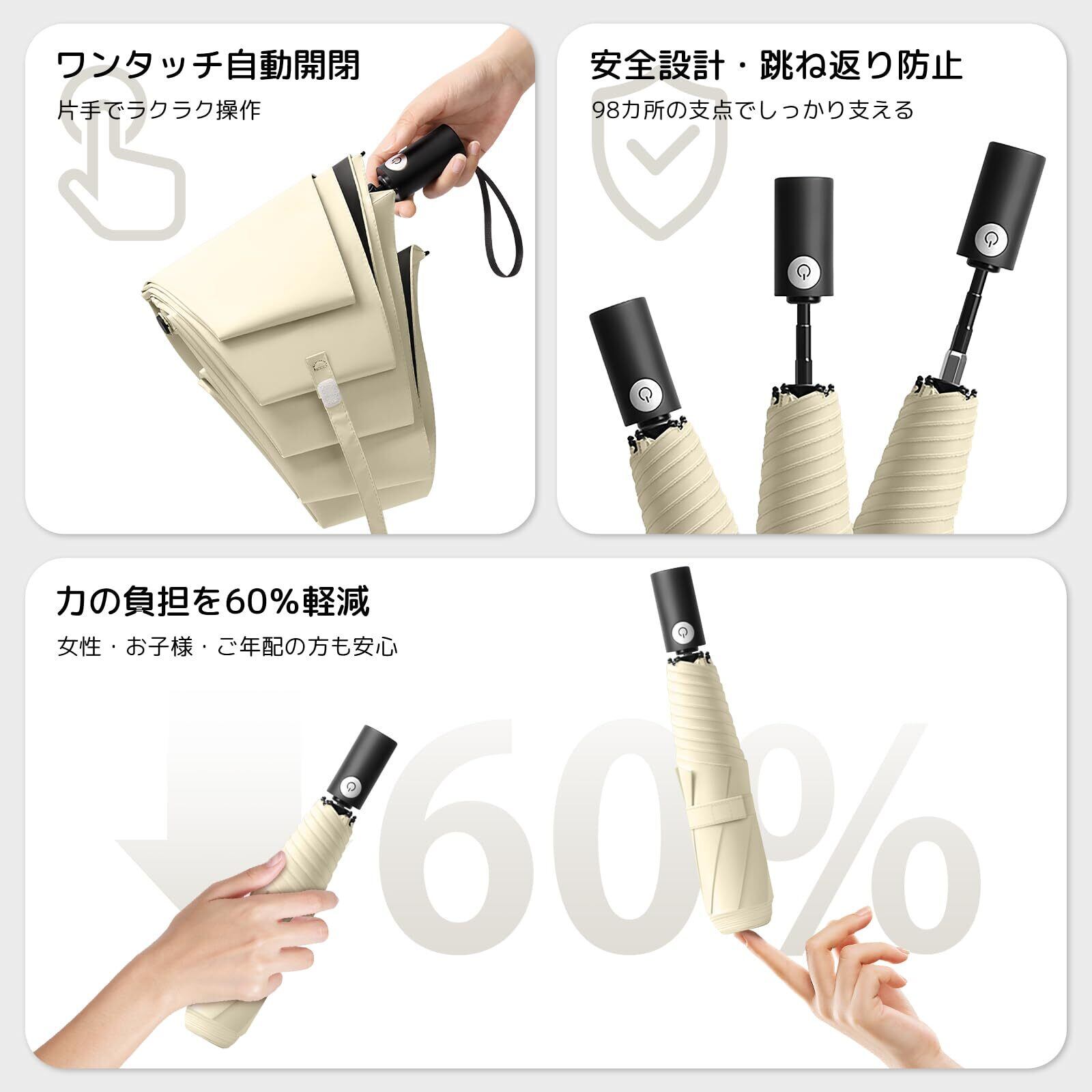 【全自動ワンタッチ開閉&98段階ストップ構造】ボタンひとつで瞬時に開閉できる全自動設計で、荷物が多い日や急な雨でもスマートに対応。さらに、98個の節が生む精密なストップ構造により、シャフトが好きな位置でしっかり止まり、勢いよく閉じる際の反発やケガを防止します。力も約60%軽減され、女性やお子様、ご年配の方でも楽に使える安心仕様。