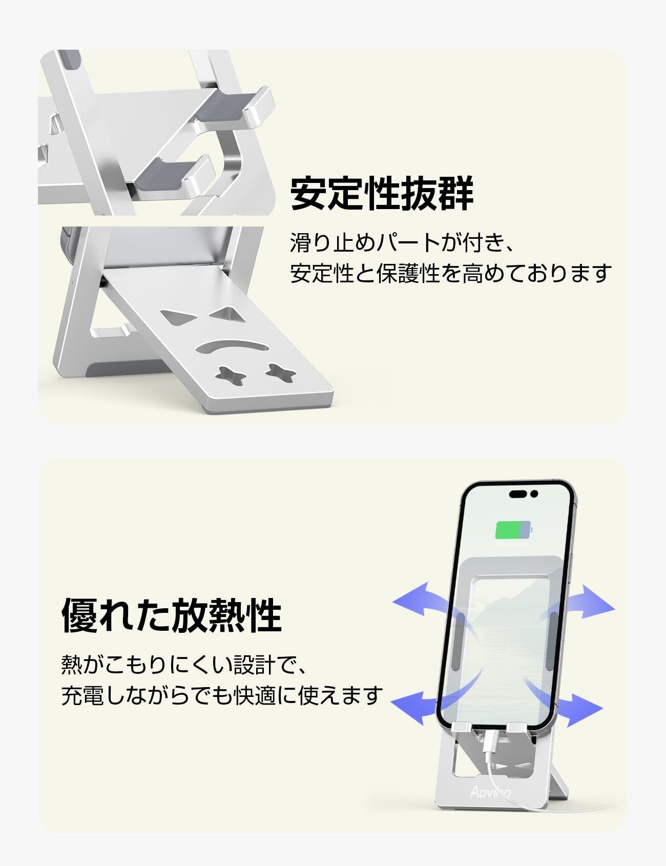 Aoviho(アオビホ) スマホスタンド 携帯スタンド卓上 薄型 スマホ立て 折り畳み iphoneホルダー phone stand 横縦置き台 アルミ合金製 角度調整 持ち運び便利 かわいい iPhone17 Air 16e 16 15 14Plus Pro Max 13 12min,Samsung,SONY Xperia,Androidなど7インチ以内のスマホに対応 (銀 シルバー)