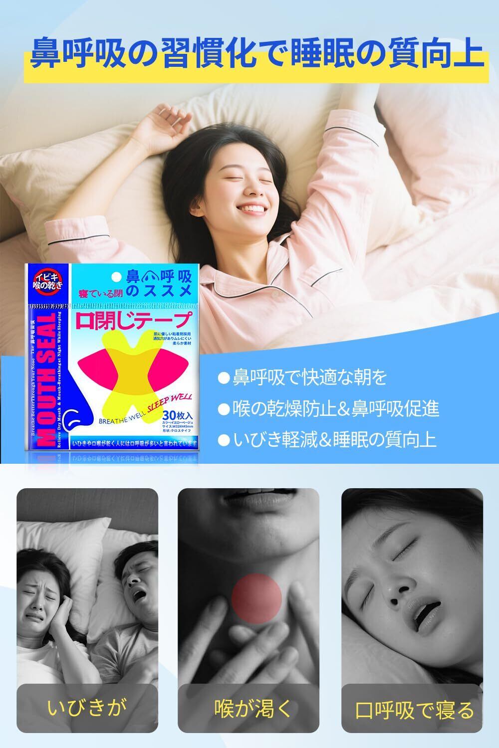 (300回用)口閉じテープ いびき対策 いびき防止テープ いびきの音を軽減 喉の乾燥防止 口呼吸防止テープ 睡眠改善 いびき防止グッズ