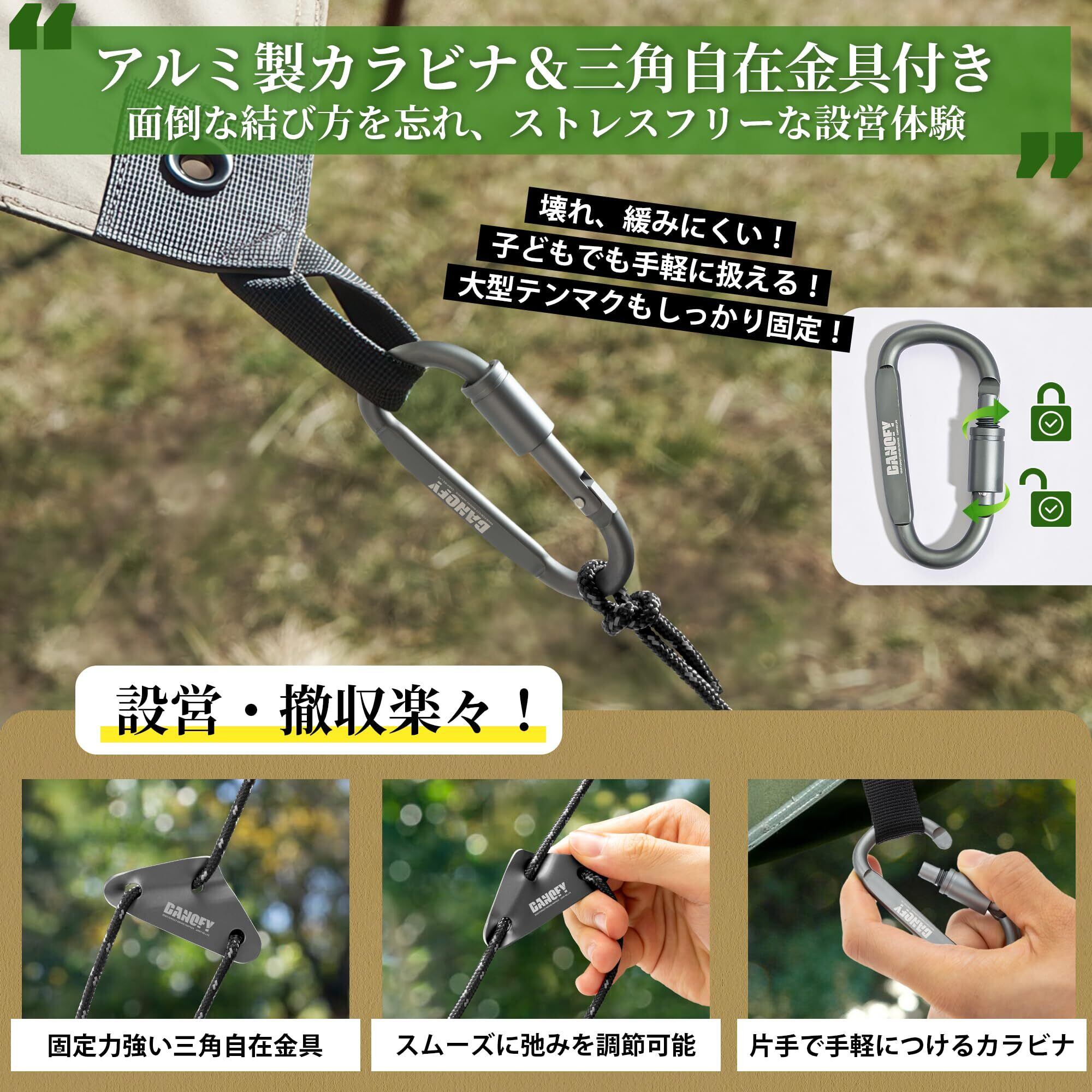 【カラビナと自在金具付き】各自在ロープにはアルミ製カラビナと三角自在金具が付属され、お届け後すぐに利用可能です。ねじ式カラビナをテントに連接するだけで、時短にタープの設営を完成し、風に当たってもしっかりとテントを止めます。三角自在金具付きで、自由自在にアウトドア ロープのゆるみの度合いを調節できます。急な雨や強風時でも素早く対処できます。
