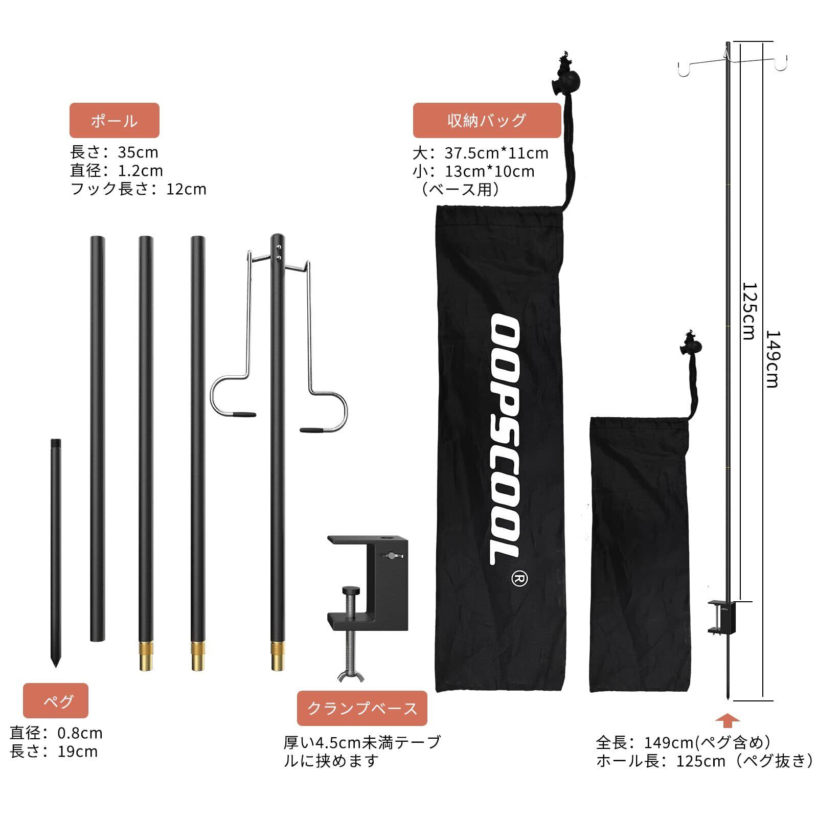 【高さ調節可能&ダブルフック設計】ランタンポールの長さは4段階に調節でき、約32cm、65cm、93cm、125cmの高さに設置することができます。卓上に置く場合は、高さを低く設定することもできます。「注目点」:ランタンフックが2つ付属し、最大耐荷重は約1kg(2*500g)です。ポールが重さでしなる場合は、ランタンハンガーの長さを短く調節してみてください。ペグを使用する場合は、地面にしっかりと固定されていることを確認してください。