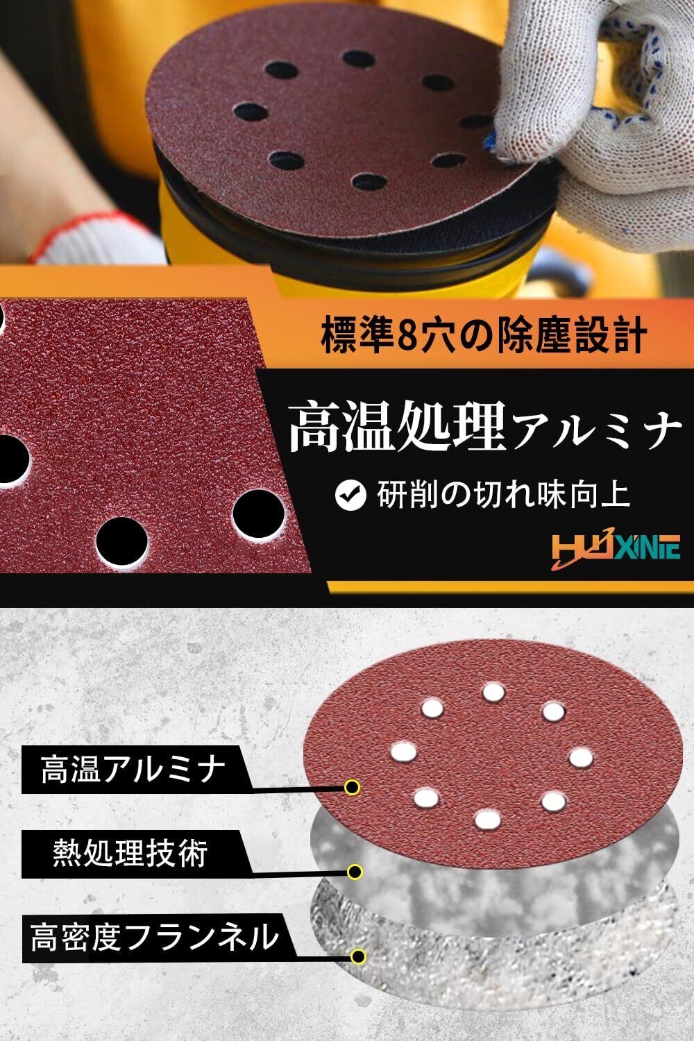 【素材の特徴】ディスクペーパー 125mm径 8穴 丸 高品質の酸化アルミニウムサンディングディスク、特殊な熱処理、頑丈で耐久性があり、さまざまな素材の研削と研磨に適しています、直径125mm / 8つの集塵穴、ベルクロスタイルのサンドペーパー、使いやすい