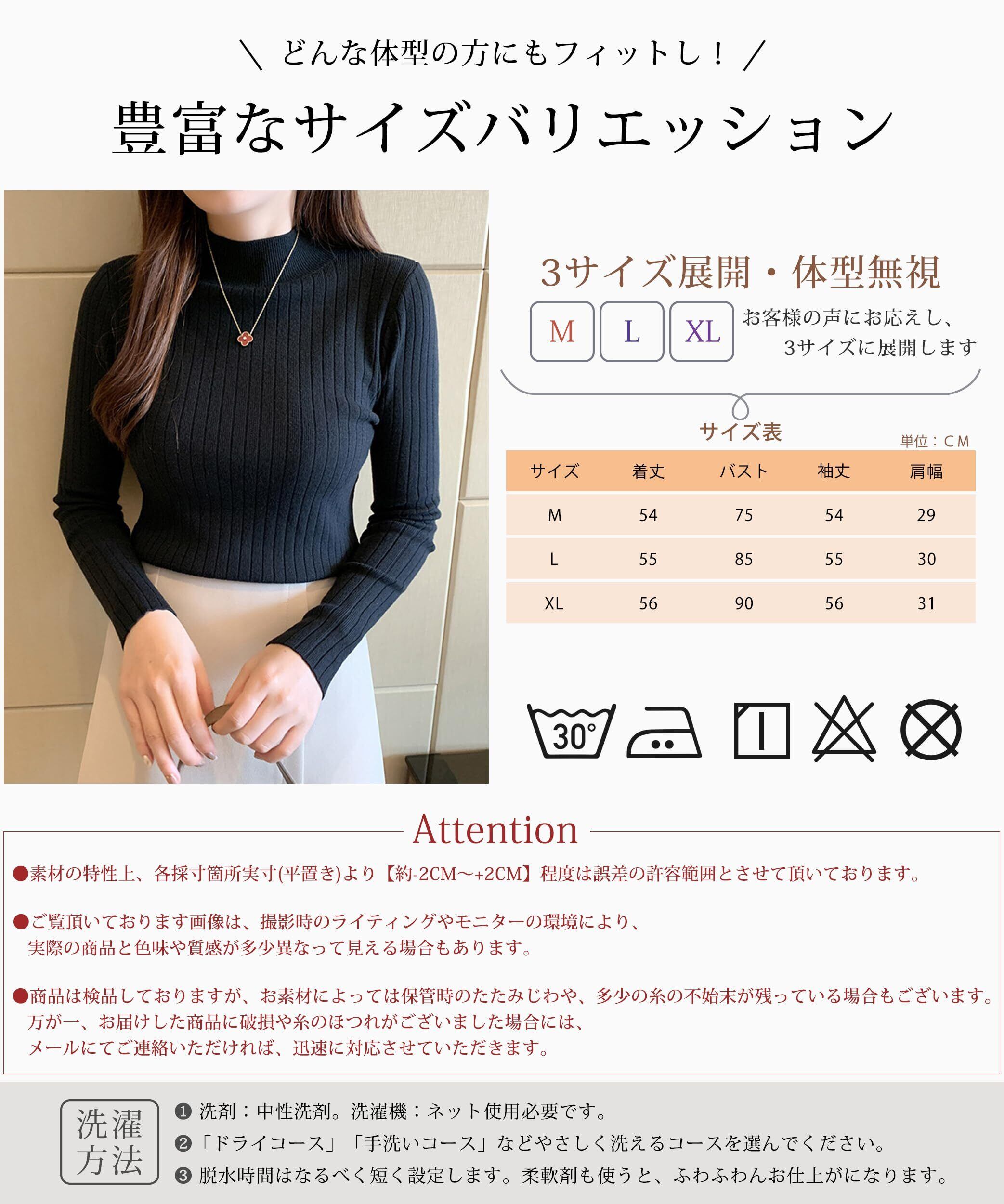 【縦リブ・細身効果引き出し】当店のセーターはハイネック部分から腕先まで、縦のラインリブが強調します。立体感がアップし、360度美しく繊細な体型を描きます。リブニットの垂直ラインはあなたにもっと美しい体型を引き立て、細見え効果も出てきます。裾、袖からチラ見せさせれば体型カバーや着痩せコーデも叶います。体にピッタとフィットして、女性らしいキレイなシルエットに見せてくるリブニットです。