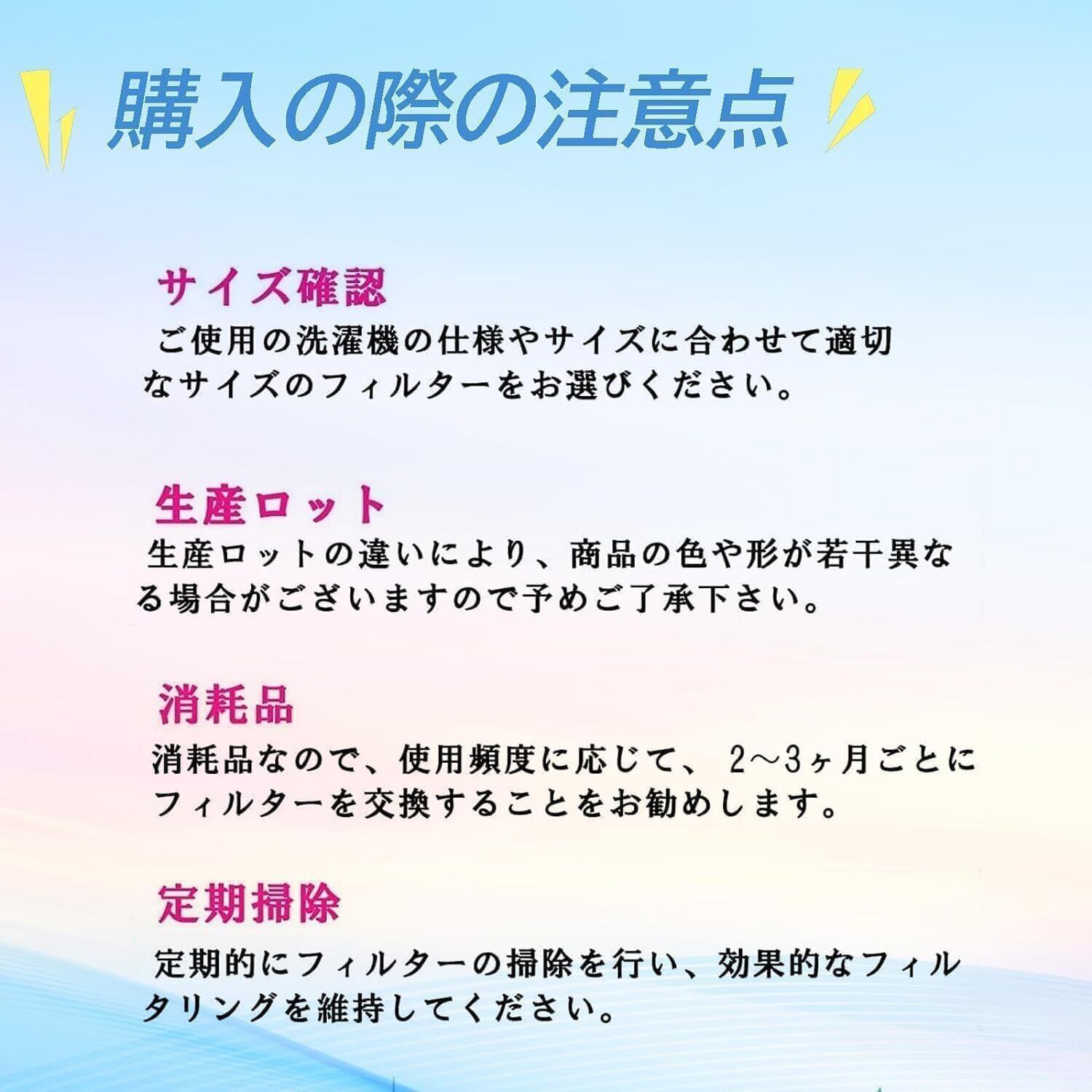 購入の際の注意点:「ご使用の洗濯機の仕様やサイズに合わせて適切なサイズのフィルターをお選びください。 ●生産ロットの違いにより、商品の色や形が若干異なる場合がございますので予めご了承下さい。それらはすべて使用可能です。」