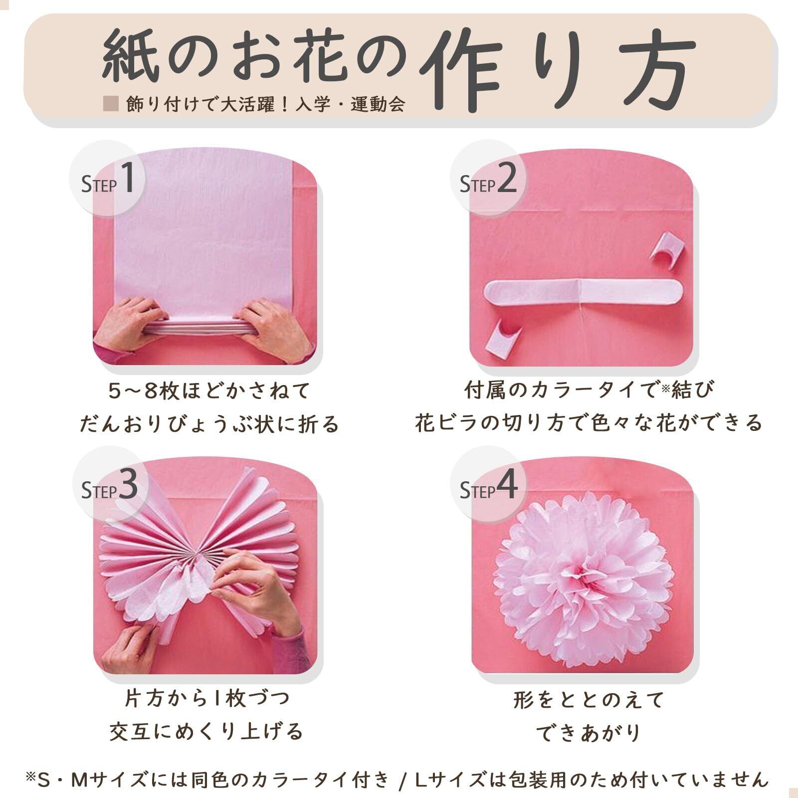 【3サイズ展開】SとMサイズは折り紙や花作りに適しており、Lサイズは花束やギフト包装紙に最適です。Sサイズ:17.3x24.5「B5判」、Mサイズ:20x29「A4判」、Lサイズ:34x50「B3判」