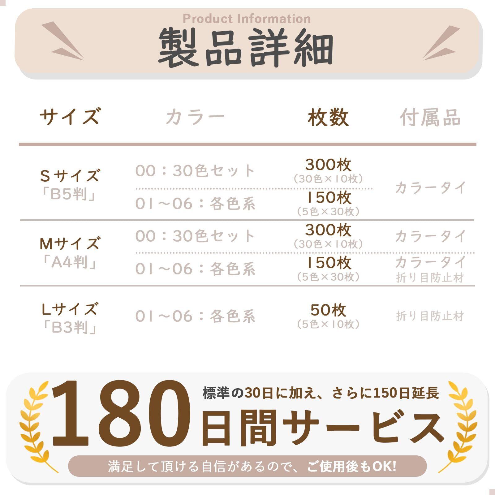 【製品仕様】SとMサイズの30色セット:各色10枚(合計300枚)。Lサイズ30色セット:各色3枚(合計90枚)。SサイズとMサイズの各カラーバリエーションセット:各色30枚(合計150枚)。Lサイズの各カラーバリエーションセット:各色10枚(合計50枚)