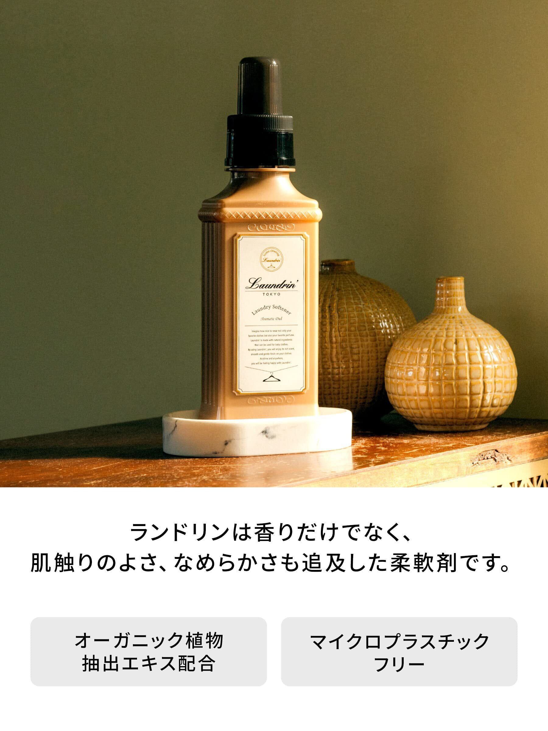 「洗濯物をふんわりと仕上げる、Laundrin'の柔軟剤が特大容量で登場!アロマティックウードの豊かな香りが魅力のこの柔軟剤は、3倍サイズの1440mlで、たっぷりご使用いただけます。お気に入りの衣服を心地よく包み込み、毎日の洗濯を特別な時間に変えてくれます!」
