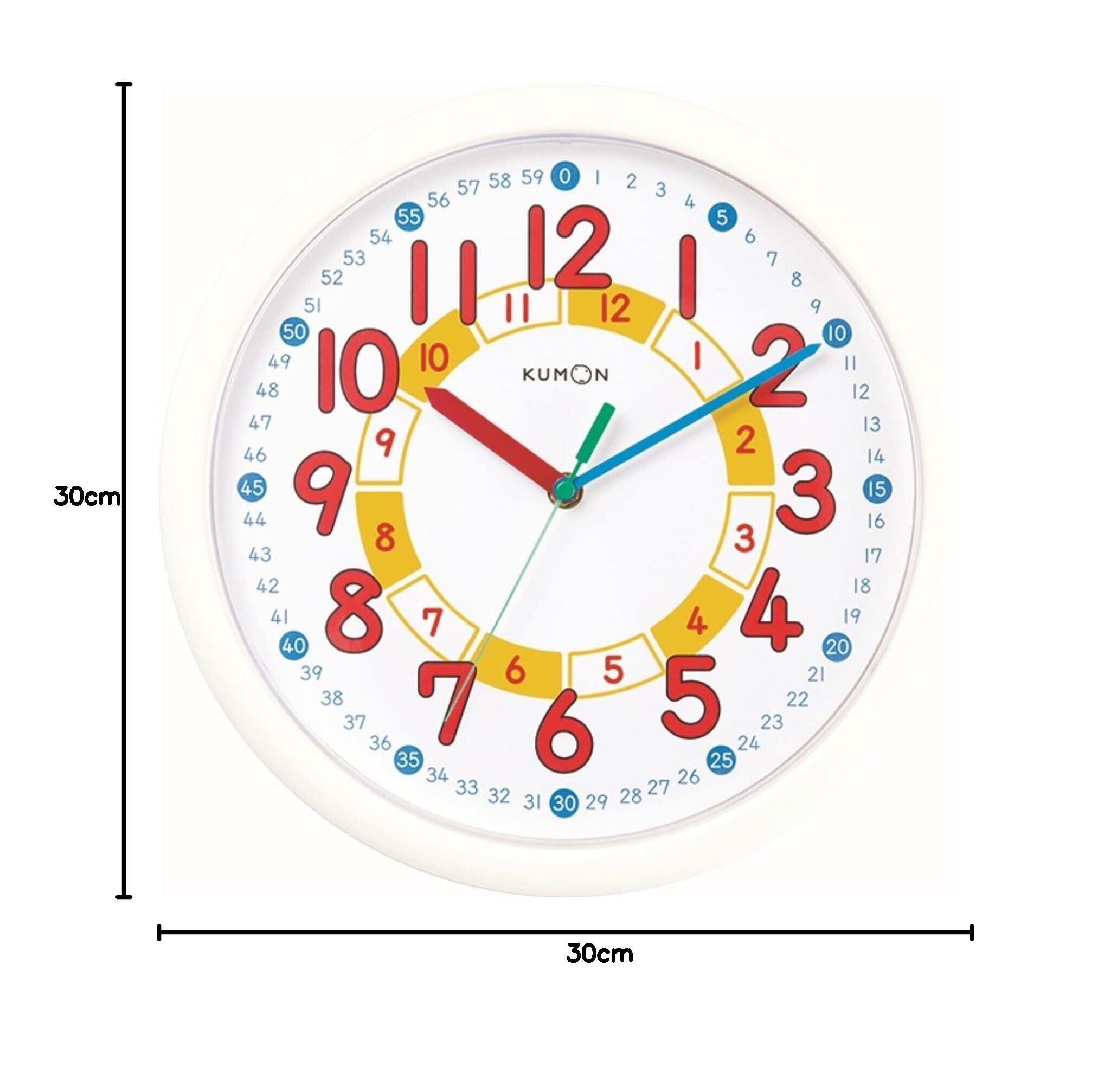 針のさしている数字を読むだけで、正しく時刻が言える壁掛け時計です。「時」と短針は赤、「分」と長針は青で表示されています。短針・長針それぞれが示す同じ色の数字を読むだけで、時刻が簡単にわかり、時計の読みかたの練習ができます。工夫されたデザインで、掛け時計として子供部屋にも適しています。