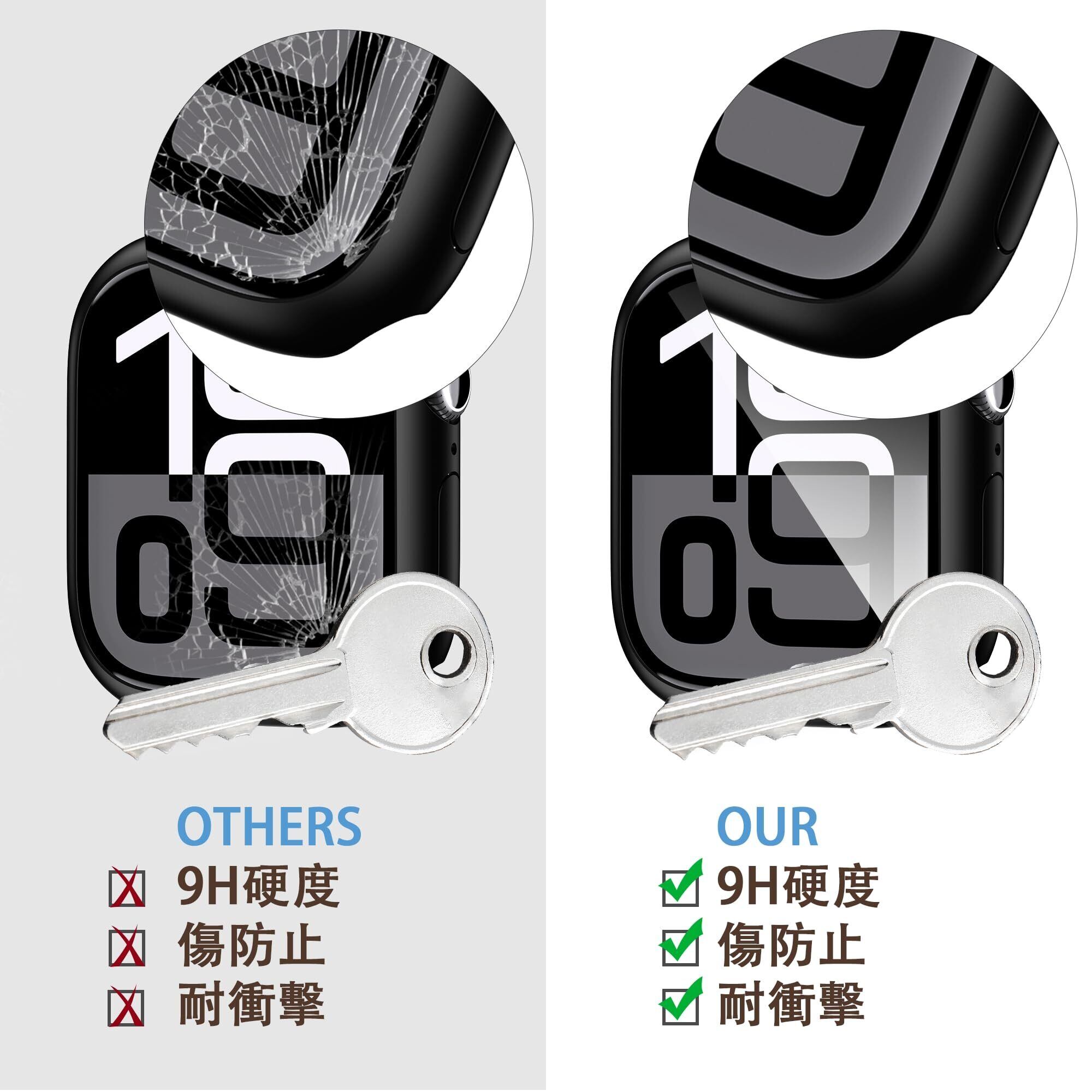 【Apple Watch 10/11防水カバー+ガラスフィルムの一体型デザイン】傷に強く耐衝撃性も兼ね備えたPC(ポリカーボネート)素材によるフレーム部と、硬度9Hで強靭な強化ガラス素材による液晶部の保護フィルムからなる2重構造です。