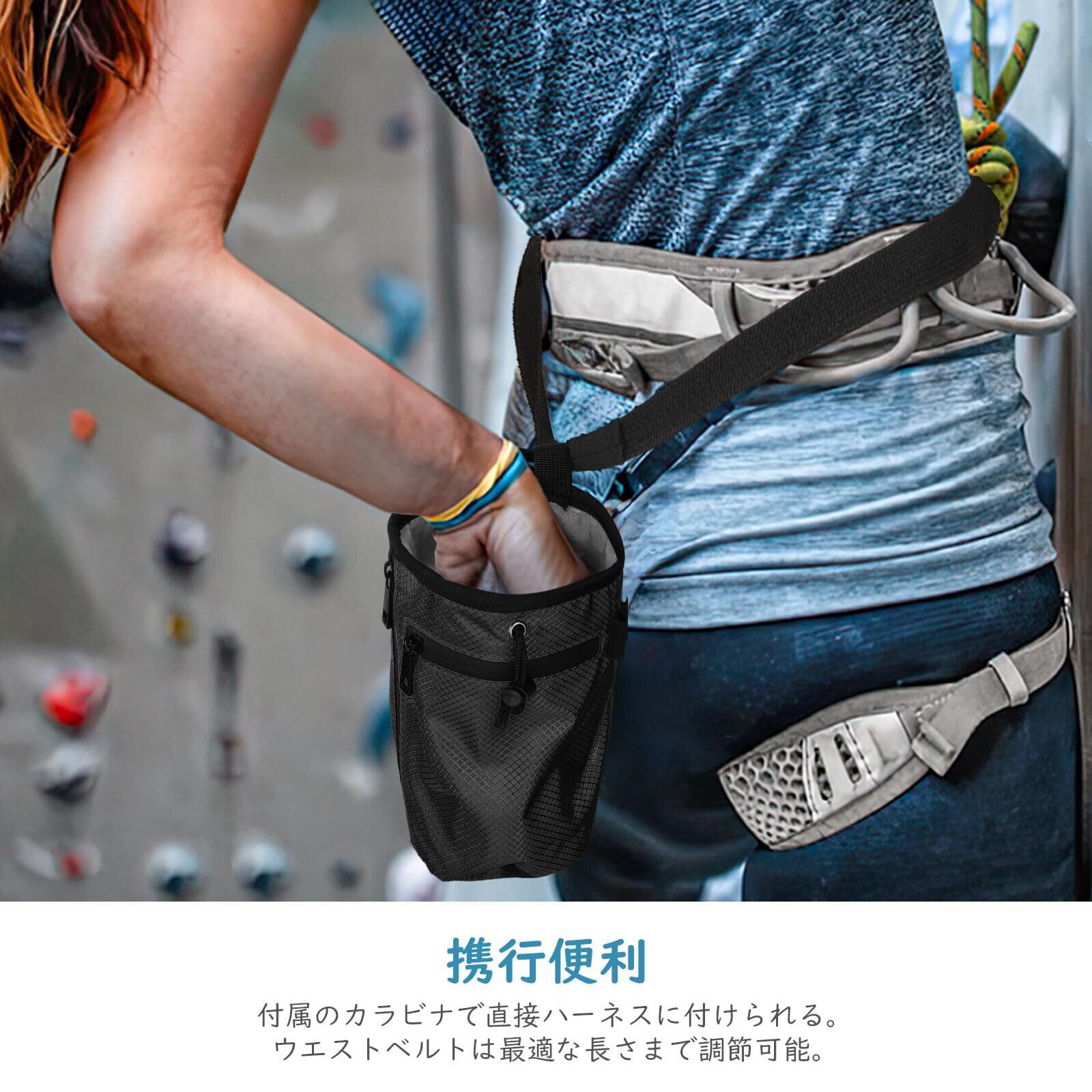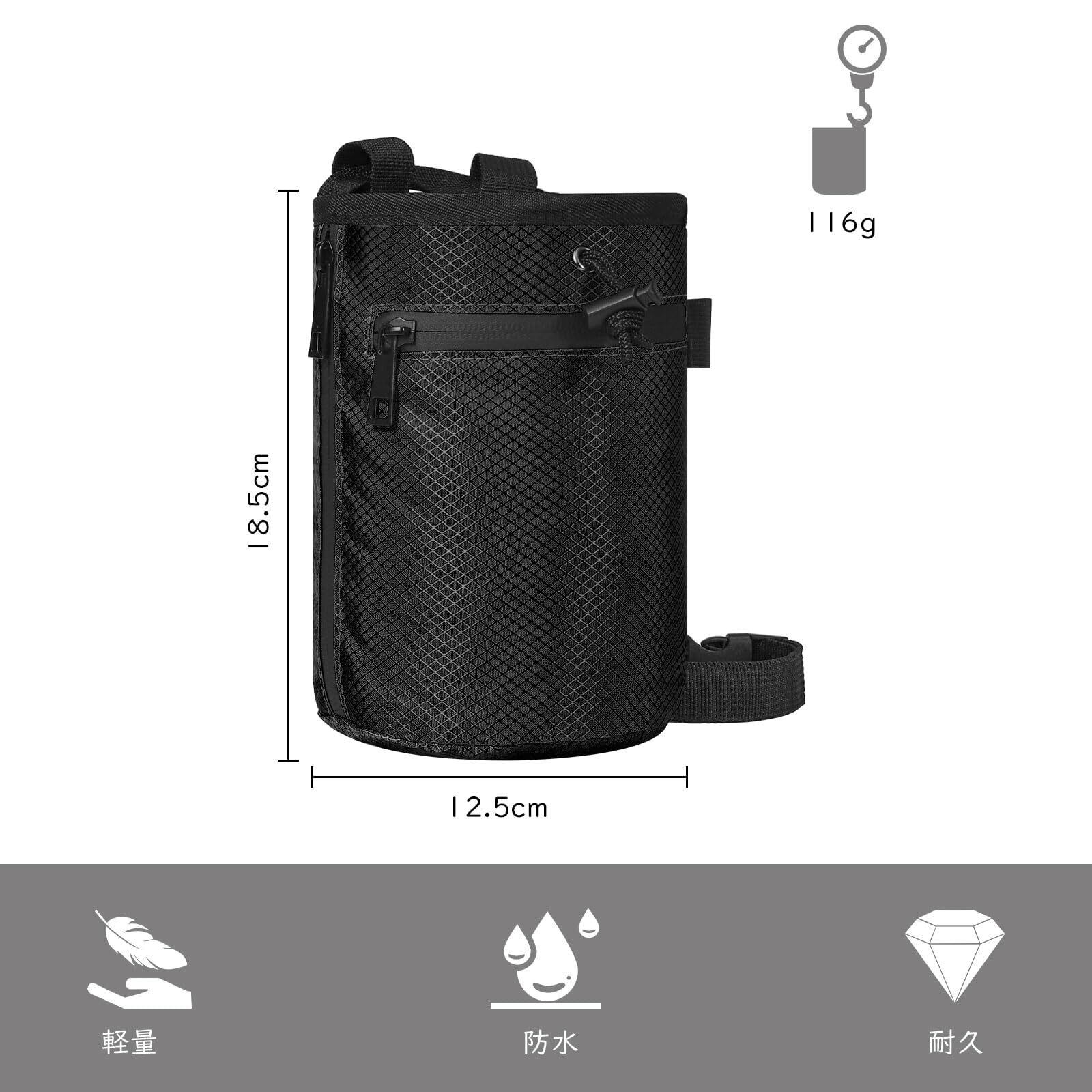 【2022最新】MoKo チョークバッグ ウエストポーチ巾着式 筒状 腰付けタイプ 広い開口部 斜め口式 表地ナイロン 裏地フリース ファスナーポケット配置 カラビナ付き 小物入れ ボルダリング クライミング アウトドア