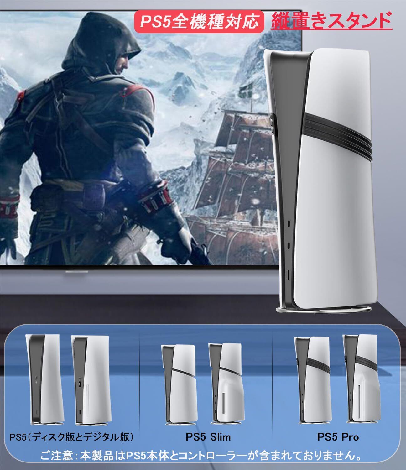 【PlayStation 5 全機種対応 縦置きスタンド】:PS5 Pro / PS5 Slim / PS5 コンソール(ディスク版とデジタル版)に対応のPS5 縦置きスタンドです。(ご注意:本製品はPS5本体とコントローラーが含まれておりません。)
