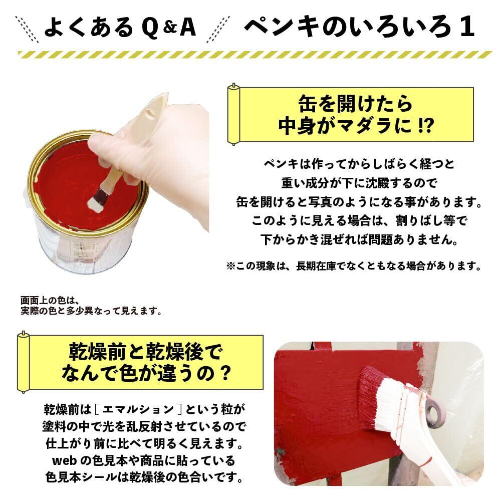 【塗装時の注意】※取扱いの際は、商品記載の注意事項等をよく読んでからご使用ください。■[使用前によくかき混ぜて]底に顔料が沈んでいますので、 必ず缶の隅々までよくかき混ぜてからご使用ください。■[塗面積・乾燥時間について]塗り面積、 乾燥時間は、気象条件、 塗る素材、 塗り方、 うすめ方によって多少異なります。■[塗装時の湿度・天気]気温5℃以下、雨天、湿度の高い(85%以上)際、及び風が強い日には塗らないで下さい。※結露する季節は午後3時頃までに塗り終えて下さい。■[塗装面は水分を無くして]塗装面が塗れていたり、湿っていると乾燥が遅れ、塗膜異常の原因になります。■[一度に厚く塗らないで]一度に厚く塗らないで下さい。■[目立たない所で試し塗してください]本番前に、目立たない所で試し塗を行い、色や仕上がり感をご確認ください。■トイレ・洗面所では塗装後1日以上、水・湯気がかからないようにしてください。■[艶がある or 未塗装の場合は]艶のある塗膜、未塗装の鉄はサンドペーパー等で表面を荒らし、清掃後塗装して下さい。