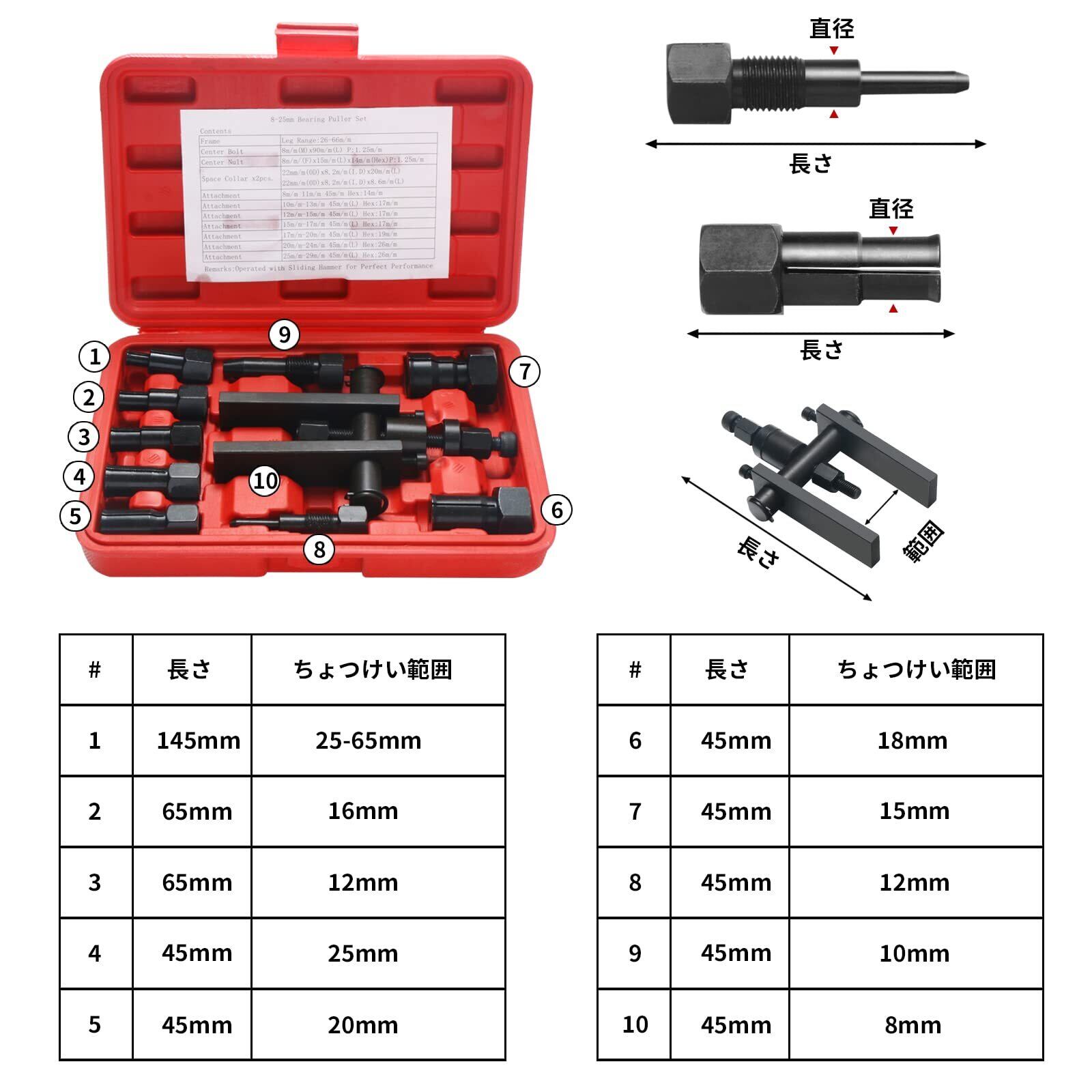 【適用内径】8-11mm、10-13mm、12-15mm、15-17mm、17-20mm、20-24mm、25-29mm。ベアリングプーラー×1、収納ボックス×1、プッシュボルト×2、チャックアタッチメント×7。