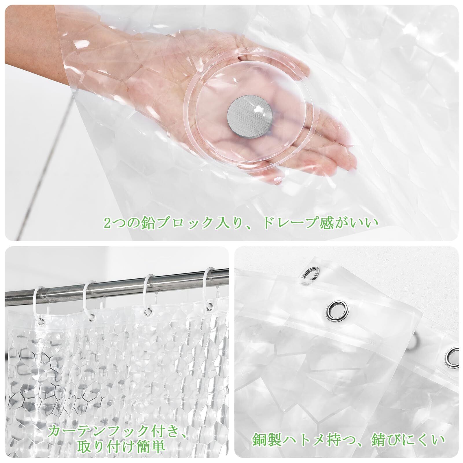 【商品仕様】サイズ:幅120cmx丈160cm 素材:EVA 仕様:3Dウオーターキューブ立体加工 パッケージ内容:本体*1+カーテンリング*8+なまりブロック*2 カラー: 半透明