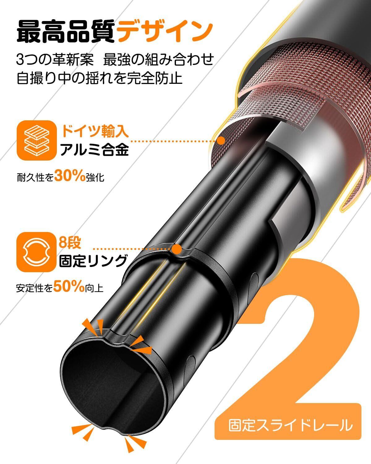 【 安定感抜群の二重スロット設計 – プロフェッショナルな撮影体験】 各関節部分に固定ロックが施されており、セルカ棒が意図せず回転することを防ぎます。これにより、よりスムーズに角度を調整でき、美しい構図を簡単に実現できます。9段階の伸縮が可能で、最大135cm(付属品含む)の長さまで拡張可能。家族写真から広大な景色まで、幅広いシーンに対応します。
