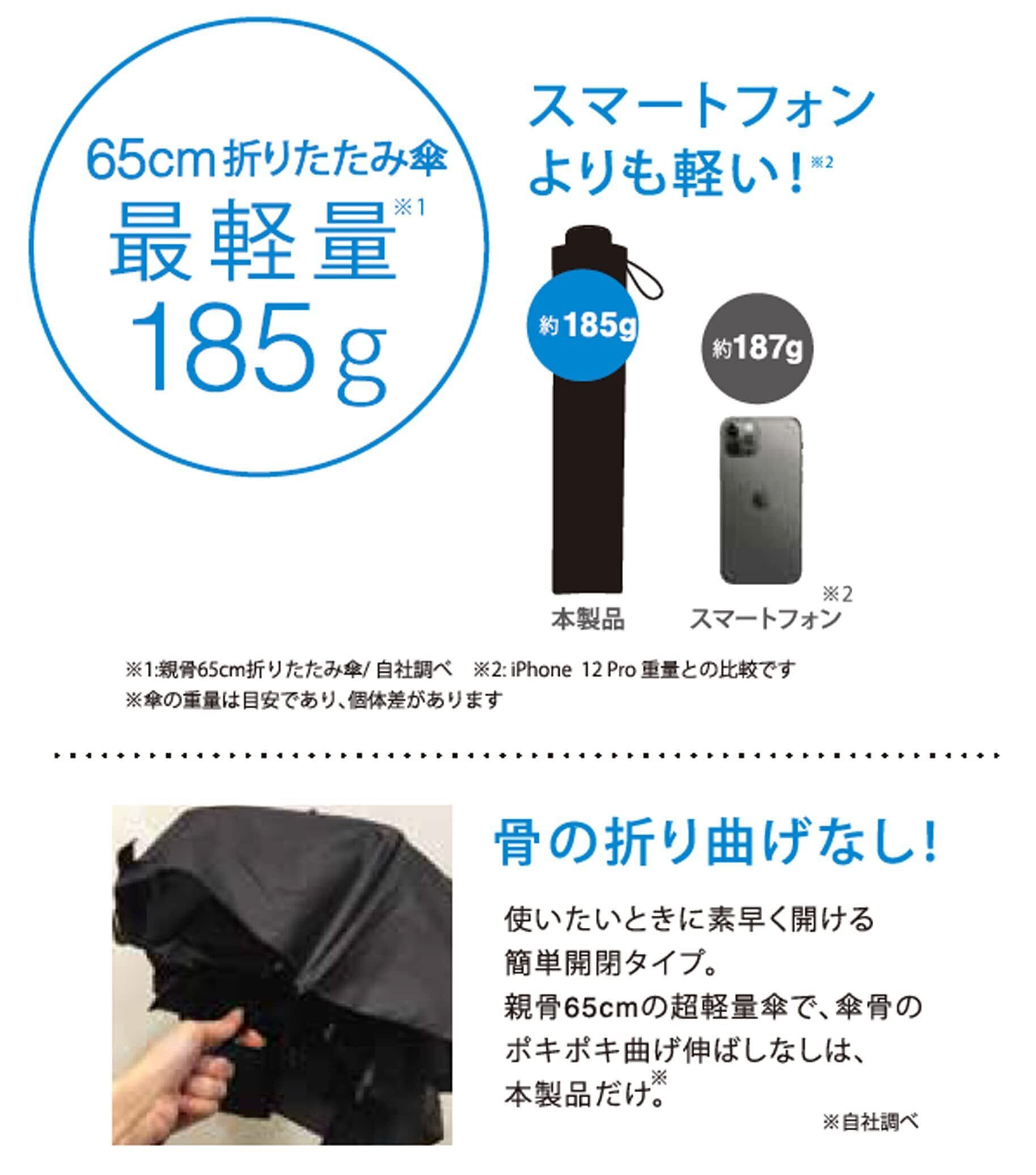 骨の折り曲げなし! 使いたいときに素早く開ける簡単開閉できる骨組み採用。親骨65cmの超軽量傘で骨のポキポキ曲げ伸ばし無しは、本製品だけ※自社調べ。いざというときにパッとさせてパッと閉じれる。自動開閉タイプにも勝るとも劣らない開閉しやすさです。、65cm折りたたみ傘で最軽量 「軽い・大きい・丈夫・晴雨兼用」超軽量傘の決定版。携帯性は抜群だけど開いたらサイズが小さめ、というタイプも多い超軽量傘。軽さはもちろん、開いたサイズも長傘と同程度で、使う時の快適さも追求しました。荷物も濡れにくいサイズ感は突然の雨でも安心です。