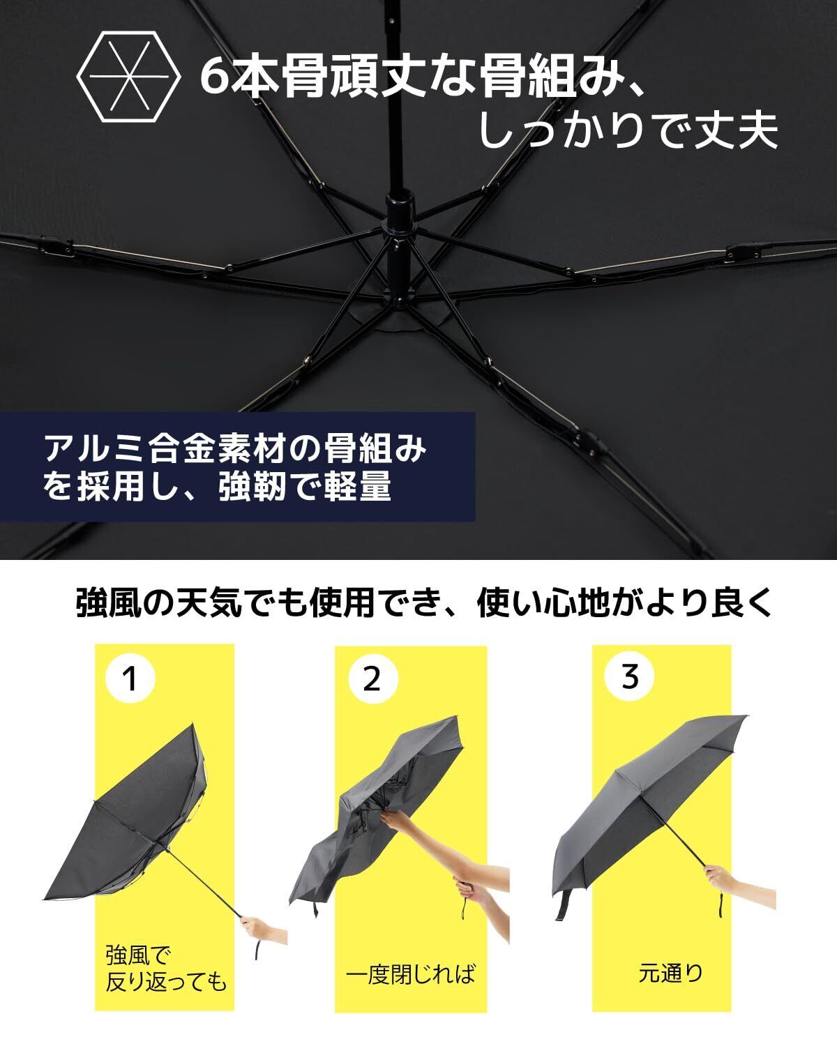 【優れた耐久性・耐風性】アルミ製の中棒とグラスファイバー製の傘骨6本を合わせて使用しており、軽量なのに耐久性があります。適度な厚みと弾力性があるので、錆びにくく強度と耐久性に優れています。ハンドルは高級なめっき技術を用いて作られている、手触りもよくて握りやすい形状で、長時間差しても手首が疲れません。