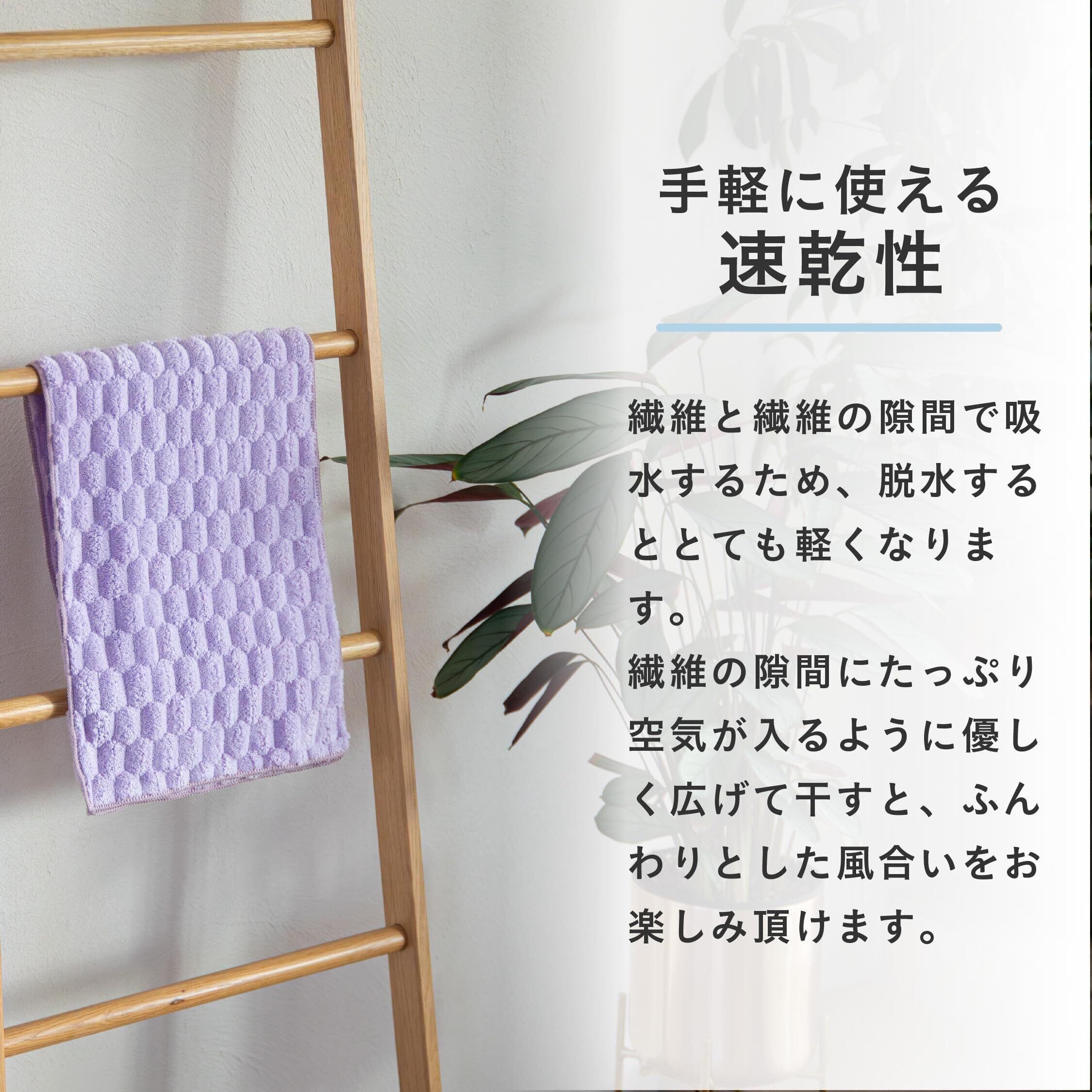 【綿の5.7倍の吸水力】水に触れた瞬間、サッと吸水してくれます。その吸水力はなんと綿のタオルの5.7倍!まるでタオルが肌に吸い付くように、水分をしっかり吸水してくれます。摩擦による肌や髪へのダメージ軽減にもなり、タオルドライの時短になります。