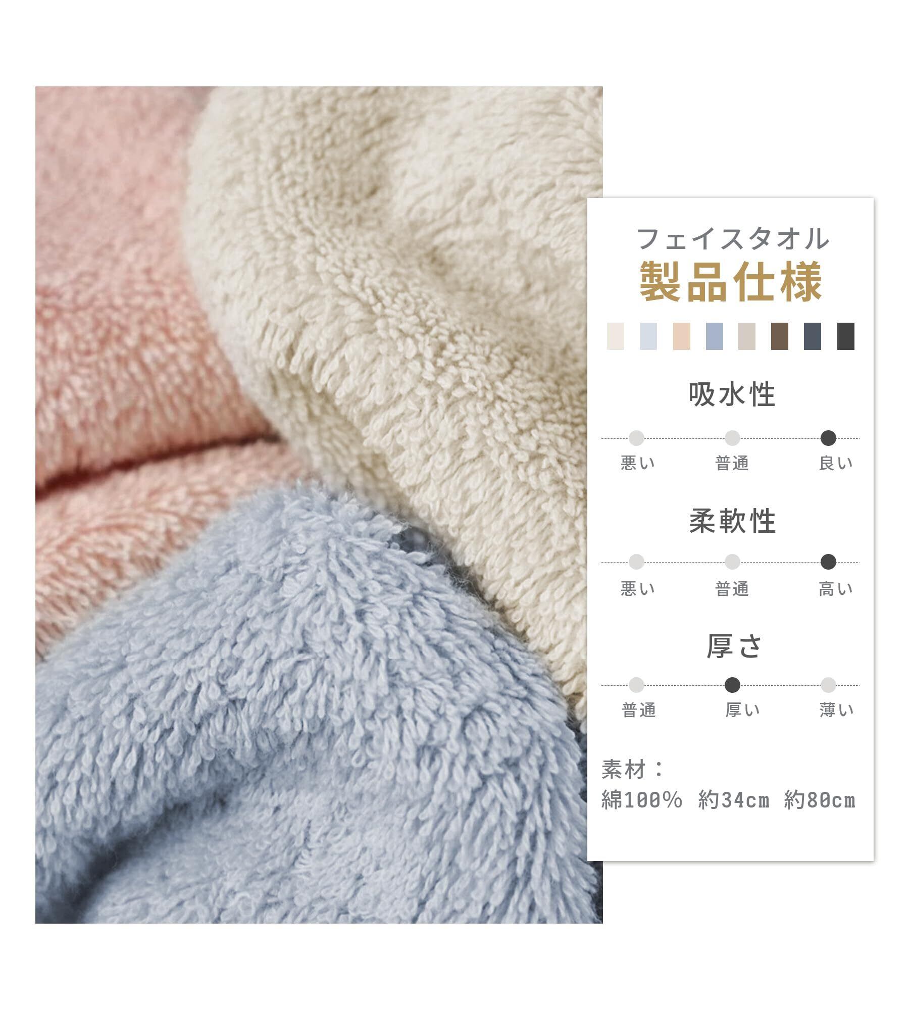 【肌触りの技術的特徴】 長繊維コーマ綿を特殊ロングパイル加工し、パイル1本1本に弾力性を持たせることで、ホテルタオル同等のふんわり感を再現。アレルギー対策として染色工程で界面活性剤を最小限に抑え、また、天然コットン100%なので、安心してお使いいただけます。