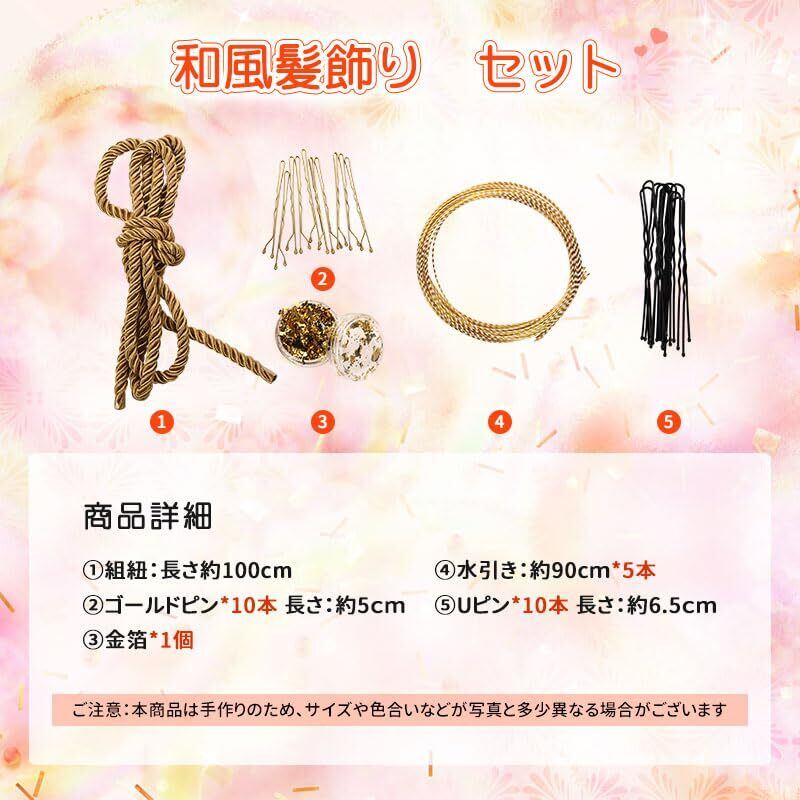 和装髪飾りヘアアクセサリーセット内容:金箔:1点 水引:約90cm*5本 Uピン:10本 ピン:10本 組紐:長さ約100cm 単体でも、他の髪飾りと組み合わせて使用するのもOKです。