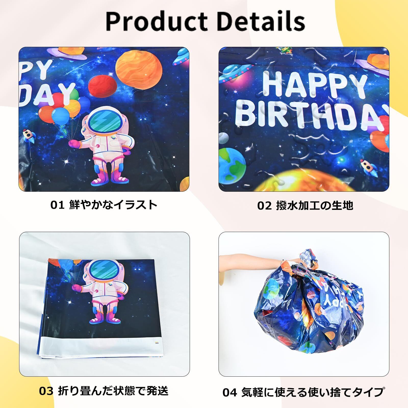 お子様の誕生日を祝うのにピッタリテーブルカバー1枚で食卓がお子さんの好きな模様替えできます。部屋の雰囲気も変わり、バースデーパーティーを華やかに演出!ハーフパーティー、100日お祝い、出産祝い、ホームパーティー、学校活動などにも適用されます。野外フェス、ピクニック、バーベキューパーティーなど子供と一緒の屋外イベントにも適用されます。