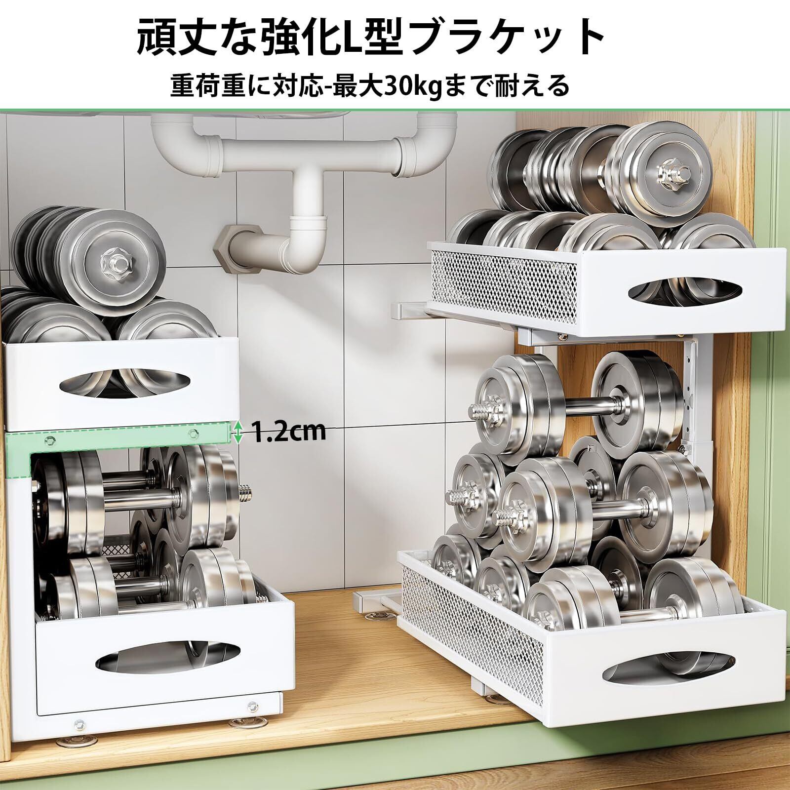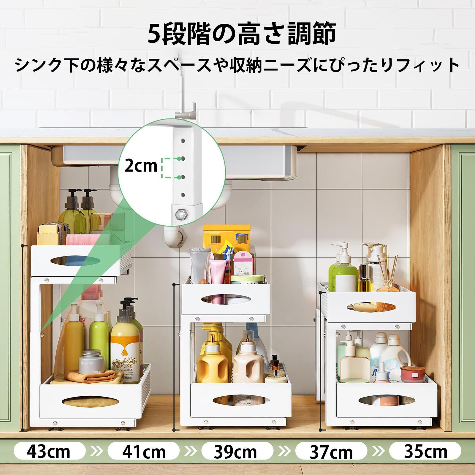 シンク下 収納 スライド 洗面所 収納 2段引き出し式 シンク下収納ラック 2個セット キッチン収納 幅20cm 洗面台下 調味料 収納 小物整理 金属製 高さ調節可能 大容量 組立簡単 キッチン/トイレ/ベッドルーム ホワイト