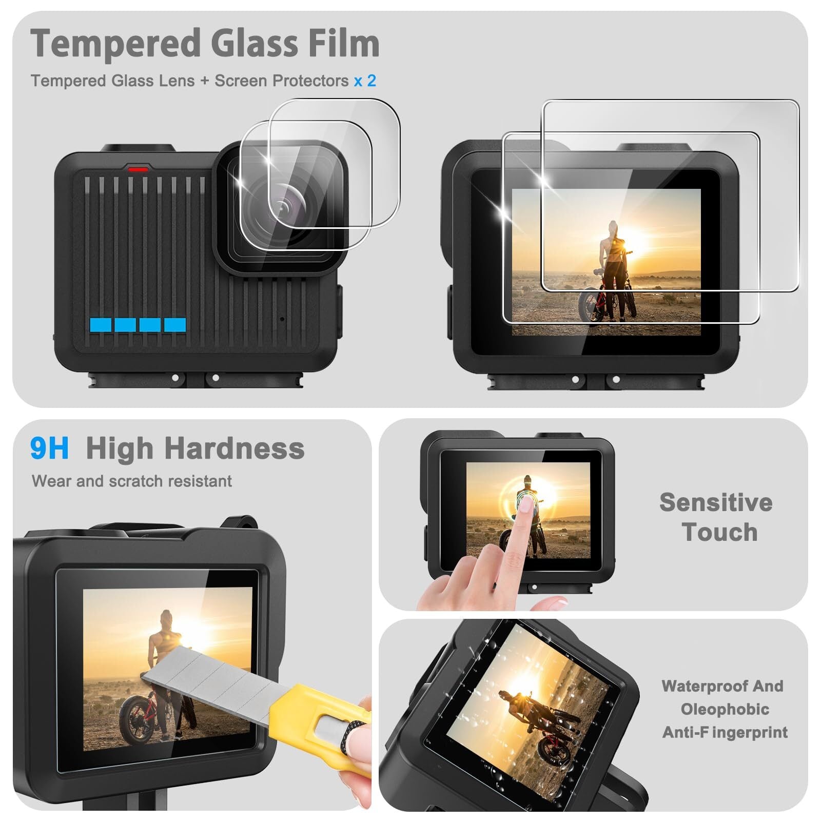 【パッケージ内容】シリコンシェルx1、強化ガラスの裏側に保護フィルムx2、強化ガラスウィンドスクリーン保護x2、シリコンレンズキャップx1、交換用バッテリーサイドドアx1、PUミニキャリーケースx1、登山バックルx1。