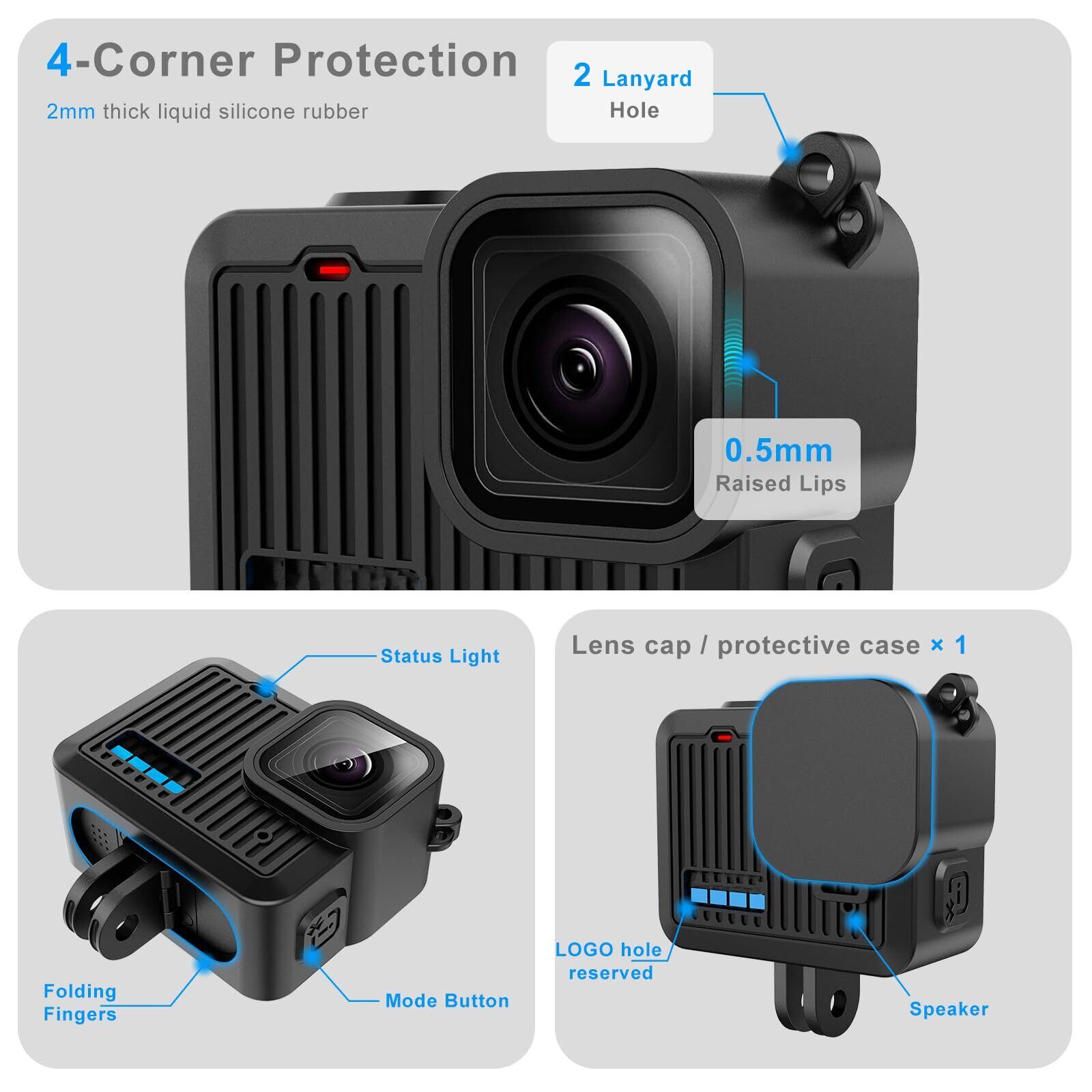 【特別なデザイン】シリコンケースは、Go Pro Hero(4K) 2024アクションカメラフレームにぴったりフィットし、シームレスな取り付けと正確な精度を実現します。安全ロープがシリコンスリーブに掛けられ、カメラをより保護します。小さなサイドドア付きの交換用サイドカバーで、充電が簡単です。 ほこりや水しぶき汚れがカメラに入るのを防ぎます。
