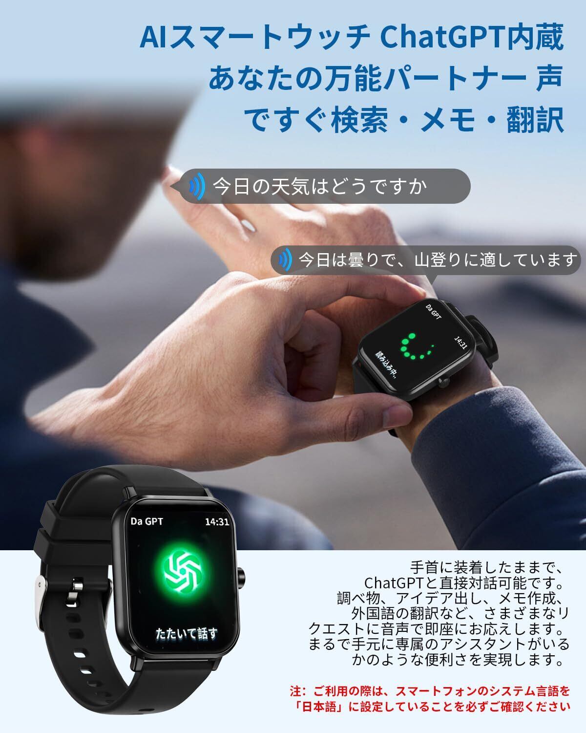 【日本語専用AIアシスタント - ChatGPT内蔵】お手持ちのスマートフォンの言語設定が日本語の場合、本製品のChatGPT機能が完全に作動します。日本語での音声質問、翻訳、スケジュール管理、文章作成などを楽しめ、あなたの最強の日本語AIパートナーとなります。本スマートウォッチはChatGPTを高度に統合。手首から、音声で直接ChatGPTに質問できる新次元のスマート体験を実現します。スマートフォンが手元になくても、リマインダー設定やToDoリストの作成、アイデアのヒントを得るなど、多彩なタスクを音声一つで完了できます。あなたの指示をインテリジェントに理解し処理する、手元のAIパーソナルアシスタントとして、日々の生活や仕事、学習をよりスマートに効率化します。