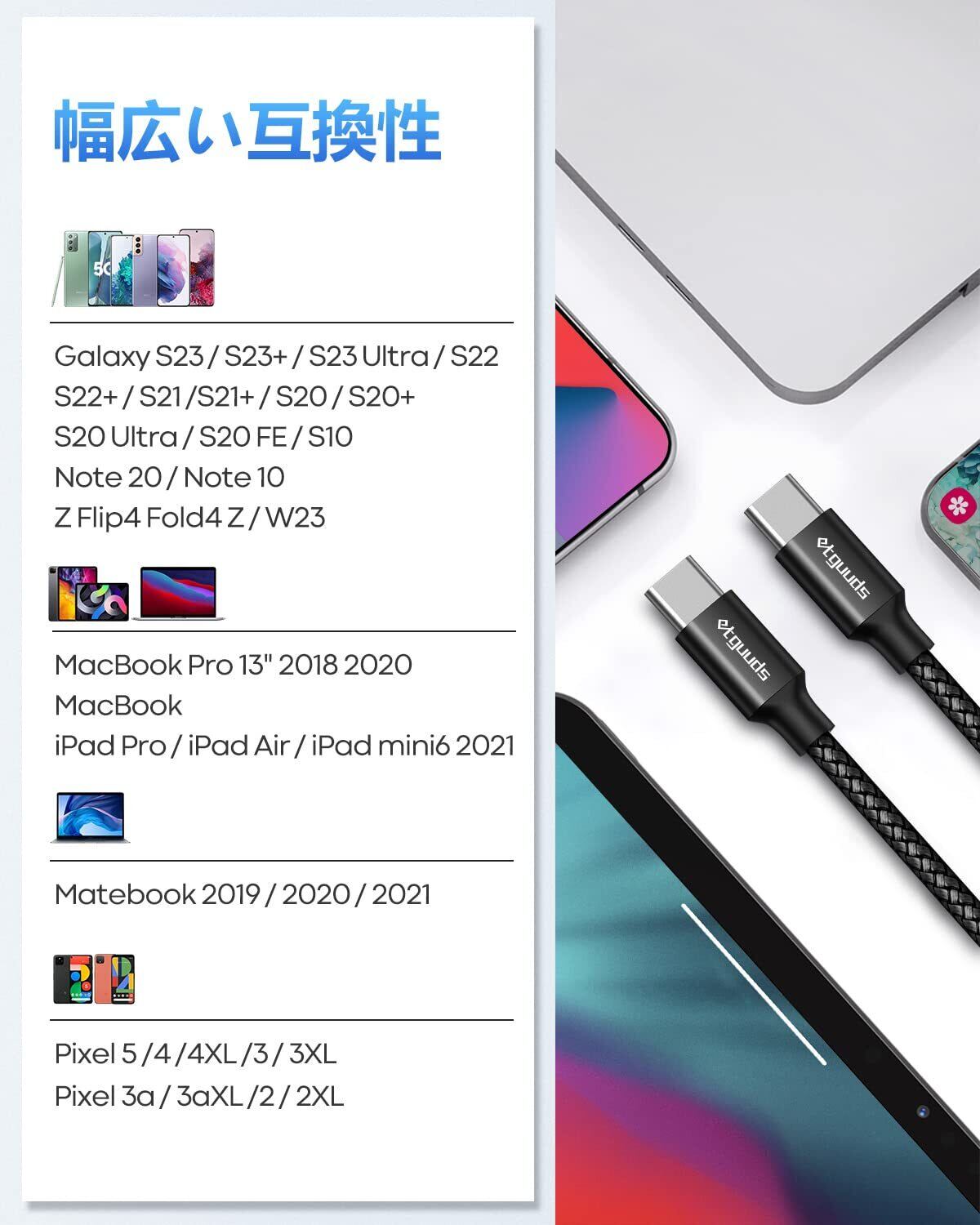 【広範な接続性】このケーブルはUSB C to USB C のポートで、スマホ、ノートパソコン、タブレット 、カーチャージャー、モバイルバッテリー、ゲーム機 などUSB-Cポート付きのデバイスに接続できます。1m/1m/2m 3本セットがあり、家用や車用やオフィスや外出用などの色々な場所で利用しています。