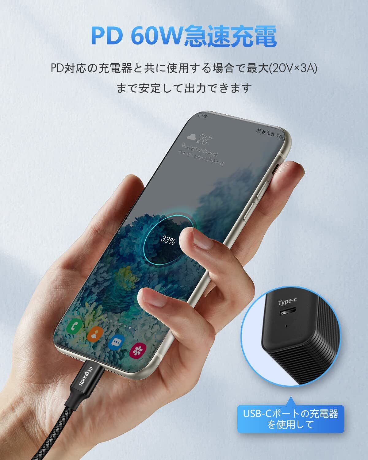 【最大60Wの高速充電】USB C ケーブルはUSB PD (Power Delivery)技術に対応し、最大60W(20V/3A)急速充電をサポートし、高効率と便利な充電を提供します。Quick Charge 3.0/2.0に対応し、最大480Mbpsのデータ転送をサポートし、1GBのファイルを数秒間で転送完了します。▲充電器と接続する機器がPD対応している場合に限ります。