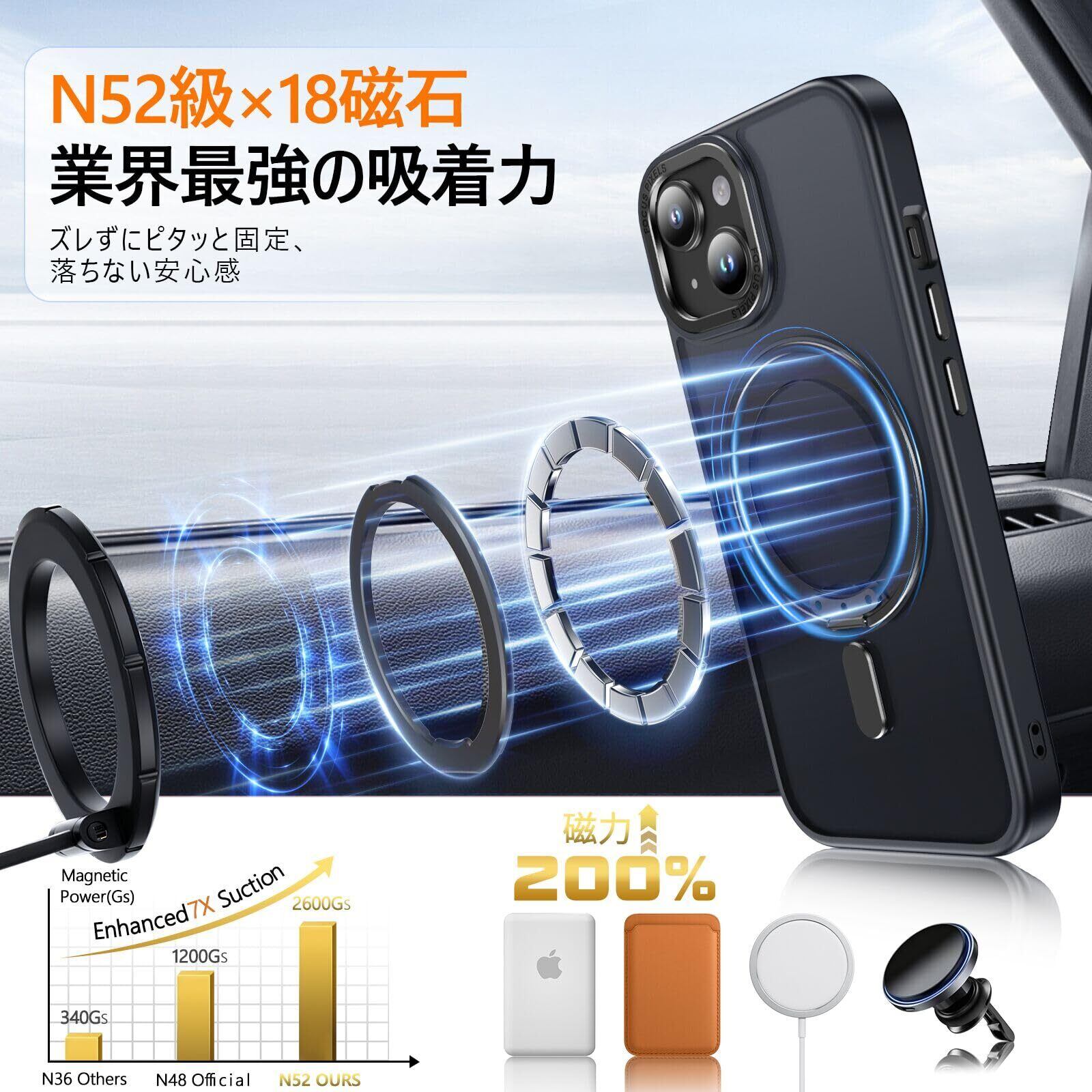「MagSafe強力磁力・充電アップグレード」:内蔵された N52グレード強力マグネットは、従来品より 約10倍の吸着力 を実現。激しい振動のある車内でも安定して装着可能。MagSafe充電器や車載ホルダーに対応し、ズレることなく高速かつ安定した充電が可能です。️ご注意:MagSafe充電器のみ対応、Qi規格のワイヤレス充電器には非対応です。