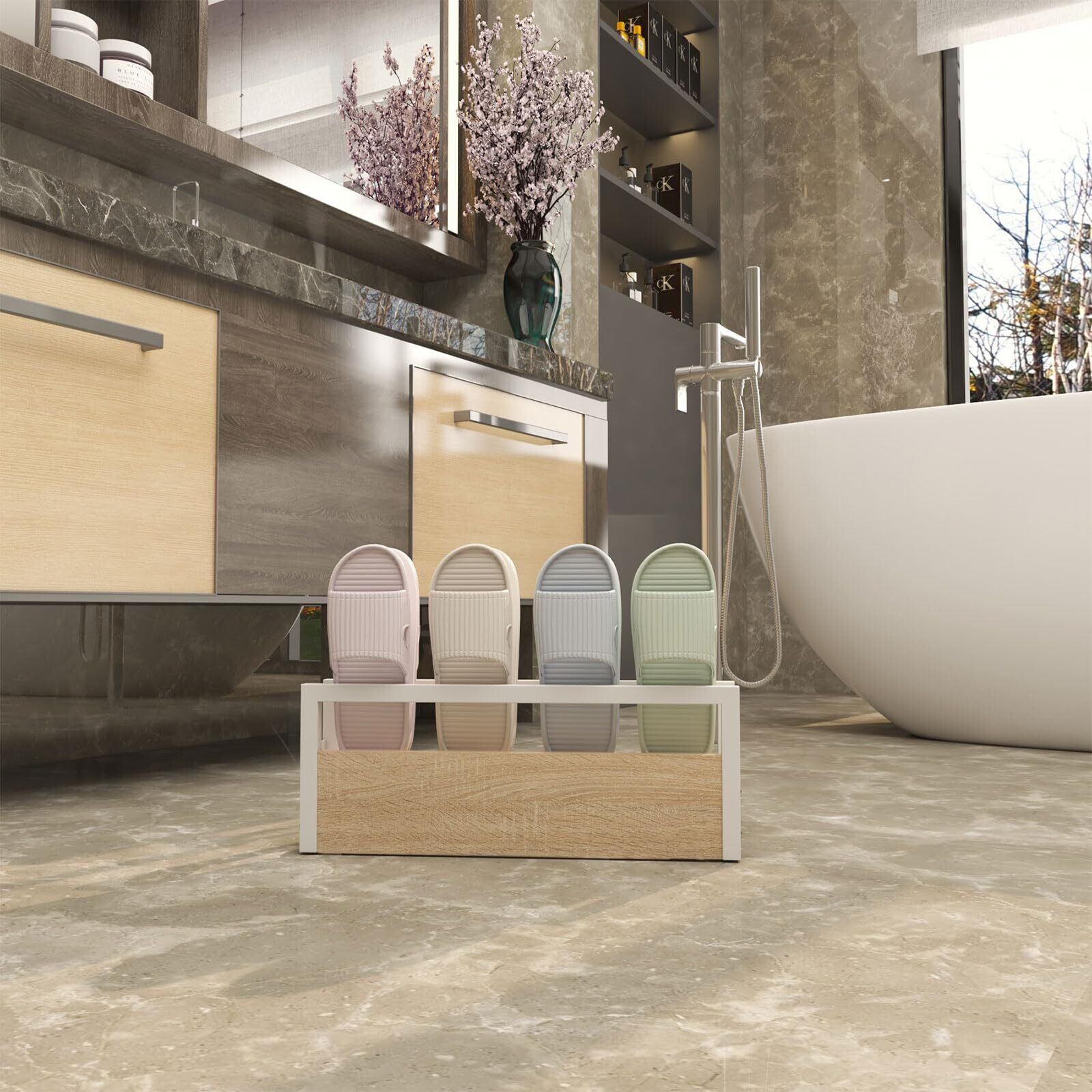 【多機能な使い方】スリッパラックはトイレ、ベッドルーム、ホテルや浴室などに適用します。使用範囲が広い。上から差し込むように入れるだけの簡単設計。組立は不要です、完全品の状態に届きました。インテリア性にすぐれ、サビや汚れに強いので雑誌や新聞の一時収納、ダンボールのストックなど、いろいろなアレンジがお楽しみいただけます。