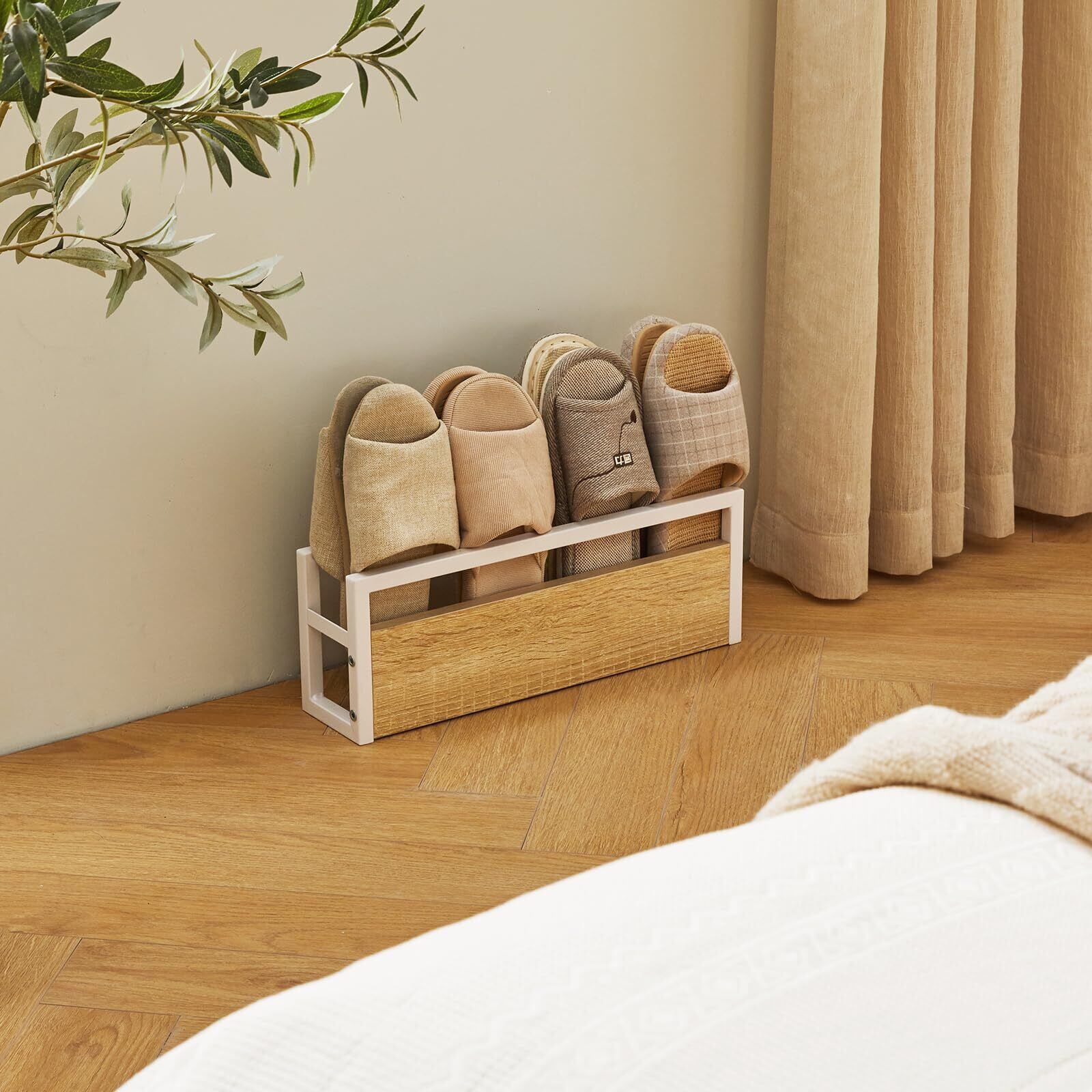 【シンプルなデザイン】高品質のパーティクルボードとアイアンフレームで作られ、頑丈で耐久性があります。木製のスリッパラックの木目は、独特のヴィンテージ・エレガンスを持っています。狭い玄関や廊下に置いても圧迫感のないスリムな横置きデザインです。ミニマムデザインで省スペースを実現。最大4足のスリッパがコンパクトに収納できます。スタイリッシュなフォルムはリビングにも調和します。