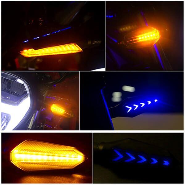 【安全性を向上させる流れるウインカー!】このシーケンシャルウインカーは、バイクに最適なデザインで、安全で視認性の高い流れるウインカー機能を搭載しています。昼夜を問わず目立つアンバーとブルーの矢印型が、周囲へのアピール力を高めてくれます。