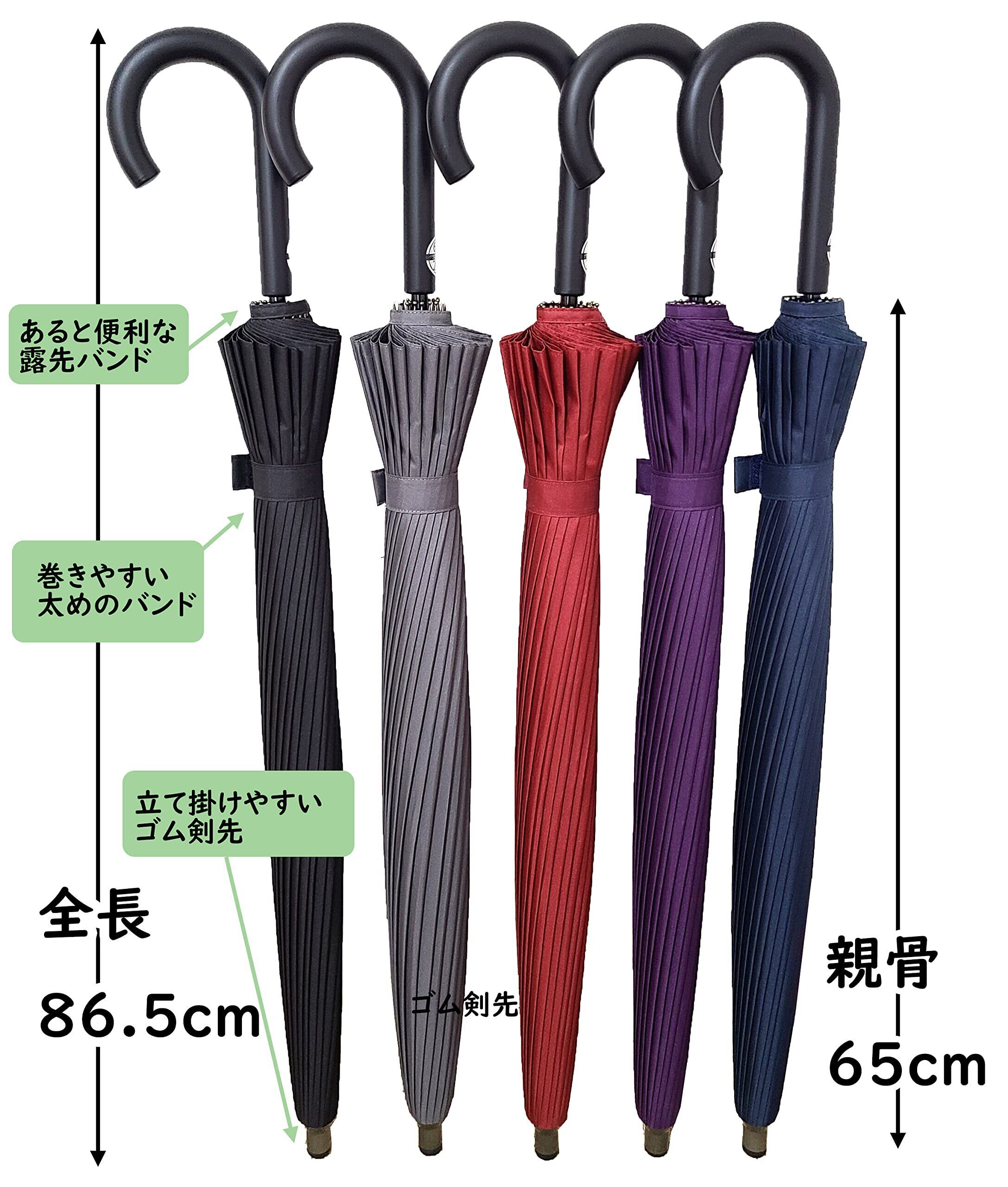 骨が折れにくく軽量で錆びないグラスファイバー骨素材。24本骨でも重さを感じない 約500g。軽量設計。 撥水生地で、さっと水切れよく、通勤 通学 電車や車 お店に 乗り入れ 入店も安心。