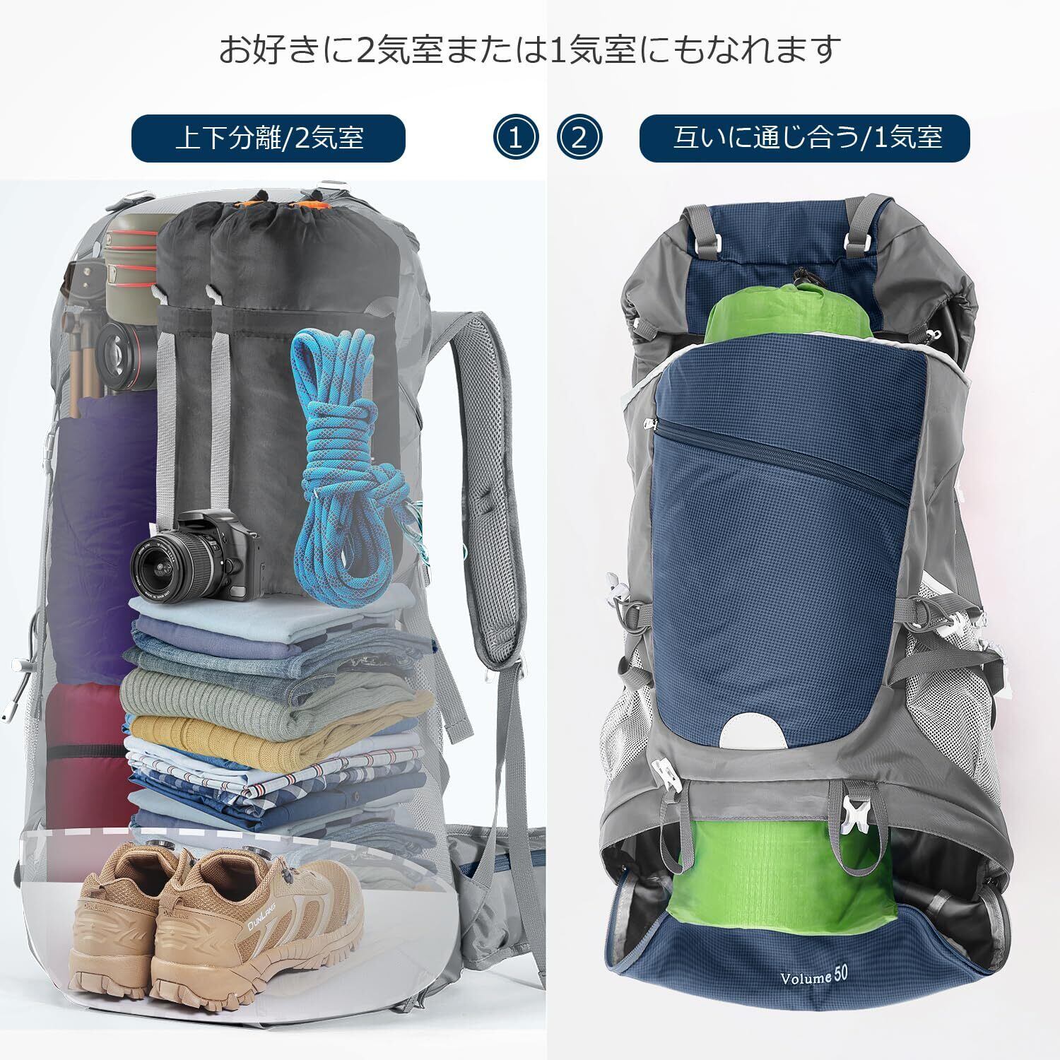 【50L大容量&2気室】サイズ:22*36*64cm 容量:50L 重さ:950g。弊社の登山リュックには、トップやフロント、サイド、ウエストポケットなどあって収納スペースが豊富にあります。また、サイドポケットは水筒やトレッキングポールなど頻繁に出し入れするモノを入れるので、山小屋泊やテント泊作りであるとラクです。お好きに2気室または1気室にもなれます。ザック下部のファスナーを下ろして、上部と下部のポケットは一つになり、スペース拡張できます。2気室なので、登山の道具をパックから取り出しやすくします。とても便利です。
