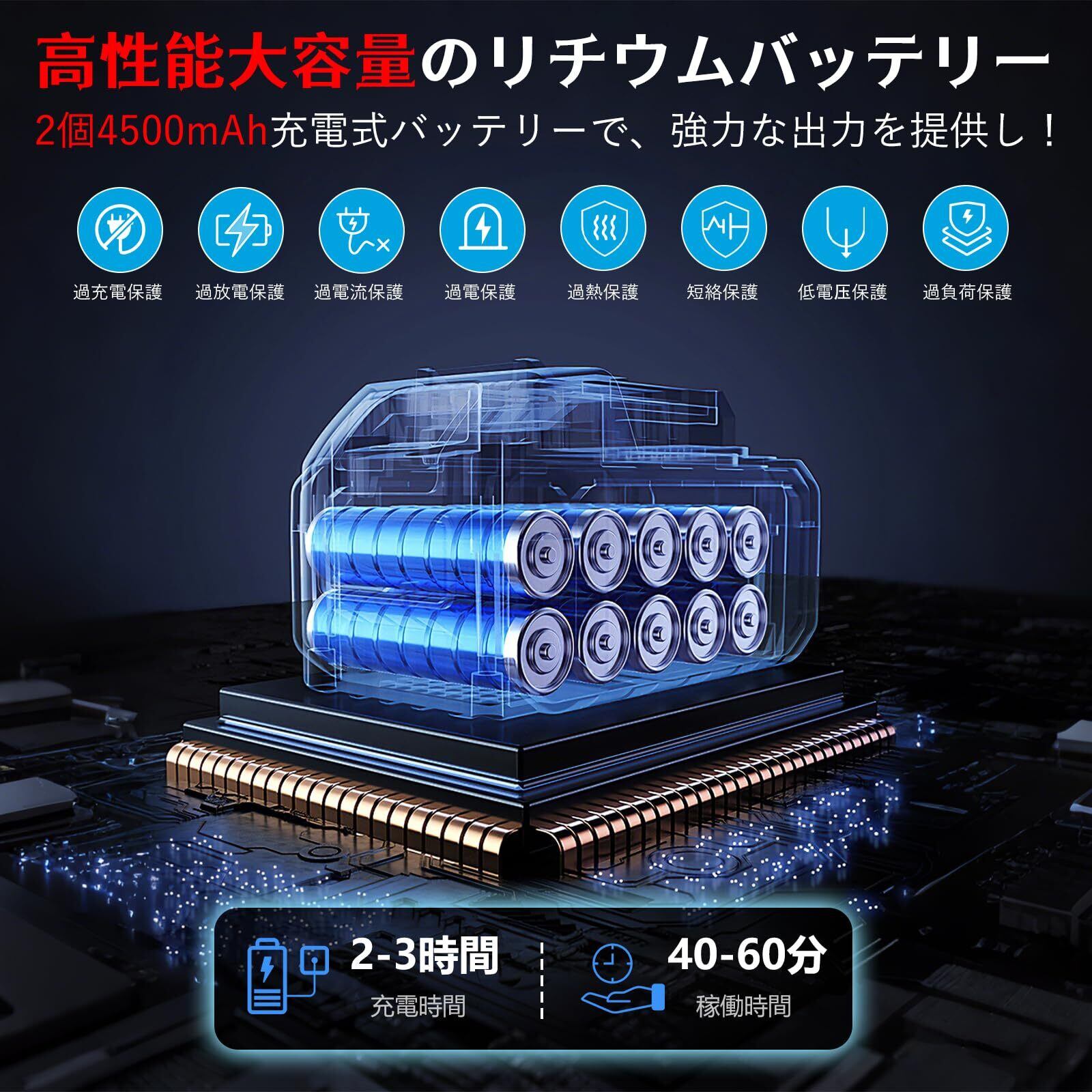 【大容量バッテリー2個付属で、交互充電で作業を中断しない】切れない作業リズム:21V/4500mAhの大容量リチウムバッテリーを2個同梱。チェンソー 充電式の連続使用時間は約30〜45分。1つを使っている間にもう1つを充電すれば、実質的に途切れない作業が可能です。過充電・過放電・過熱保護機能も搭載し、バッテリー自体も長持ちします。「作業中にバッテリー切れ...充電待ちでやる気が中断される」というストレスから解放。広い庭の手入れや、薪割りなどまとまった作業でも、余裕を持って取り組めます。