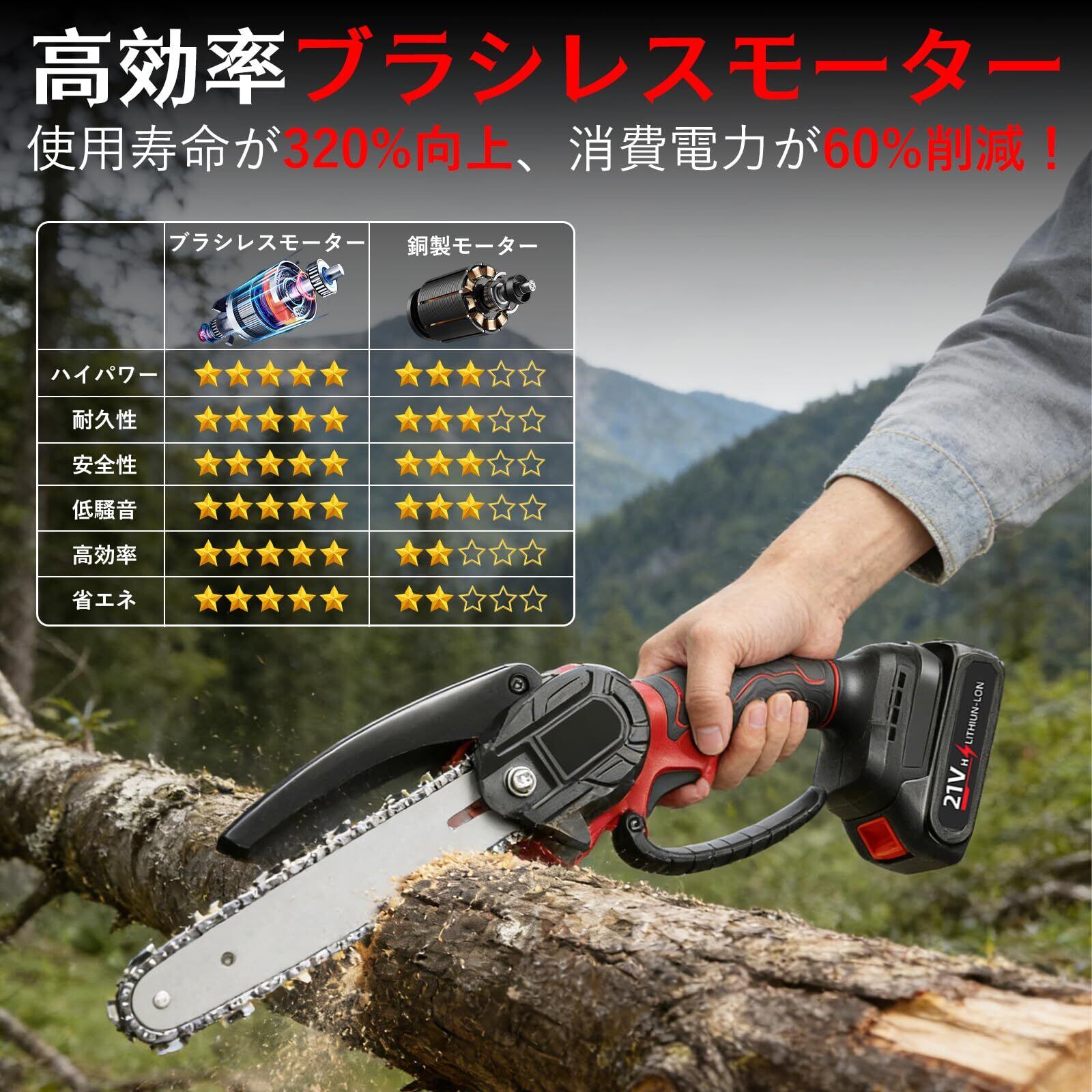 【使い続けてもパワーが落ちない、長寿命なブラシレスモーター】驚異の効率性:従来の銅製モーターに比べ、寿命が320%向上、出力が80%向上しながら、消費電力を60%削減。550Wの高出力チェーンソーと2500r/minの高回転を実現しながら、火花・煙・摩耗粉を発生させず、メンテナンスフリー。バッテリー1つで従来より格段に長く、力強い作業が可能です。「昔使っていたものは、すぐにパワーが落ちて買い替えが必要だった...」という煩わしさから解放。何年経っても新品同様の切れ味を維持し、コストパフォーマンスに優れた一本になります。