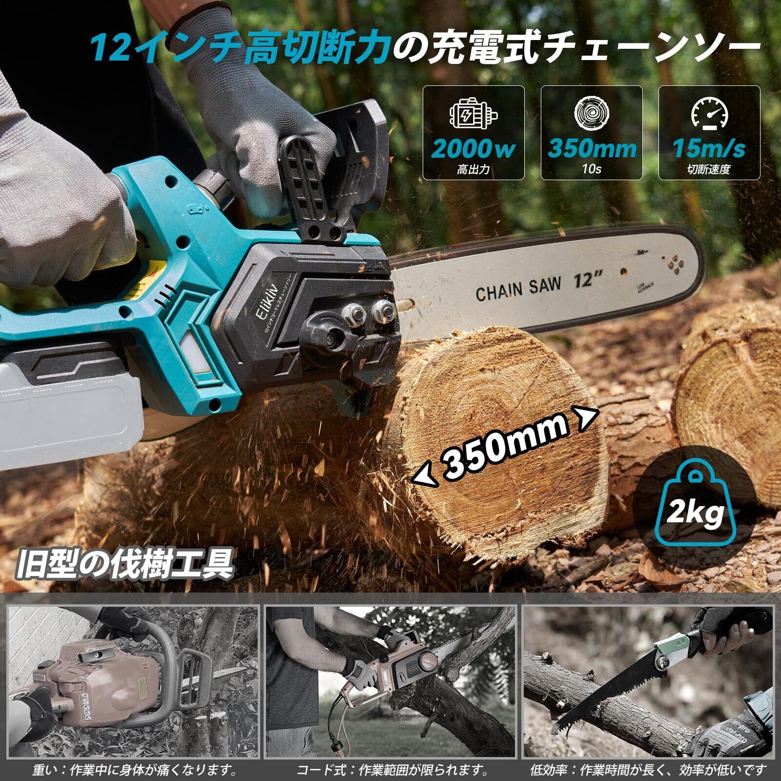 【2025新型】Elikliv 12インチ 電動チェーンソー 充電式 切断径 350mm ブラシレスモーター 自動給油 ツールレス・チェーン調節 残量表示可能 ガーデニング 家庭用 木工切断 大工道具 園芸設備 伐採 薪作り 18Vバッテリー対応 BL1830 BL1840 BL1850 BL1860 替刃1 本 収納ケース 日本語取扱説明書付き 本体のみ バッテリー別売り