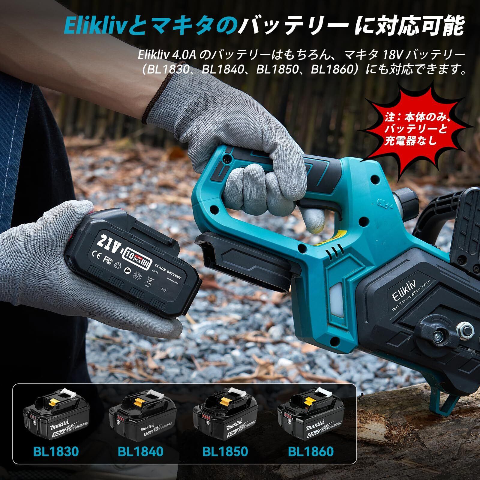 ️ご注意:【本体のみ・18V バッテリー対応】お客様から「既にバッテリーをお持ちです」との声をいただきましたので、電動チェーンソーの本体のみの販売を開始しました!弊社 Elikliv の 4.0A バッテリーはもちろん、BL1830b、BL1840b、BL1850b、BL1860b など、多種多様な 18V バッテリーに対応しています。コードレス式なので、電源コードを接続する手間が全く不要で、自由自在にお使いいただけます。使い勝手抜群で、あなたの作業効率を飛躍的に高めます!