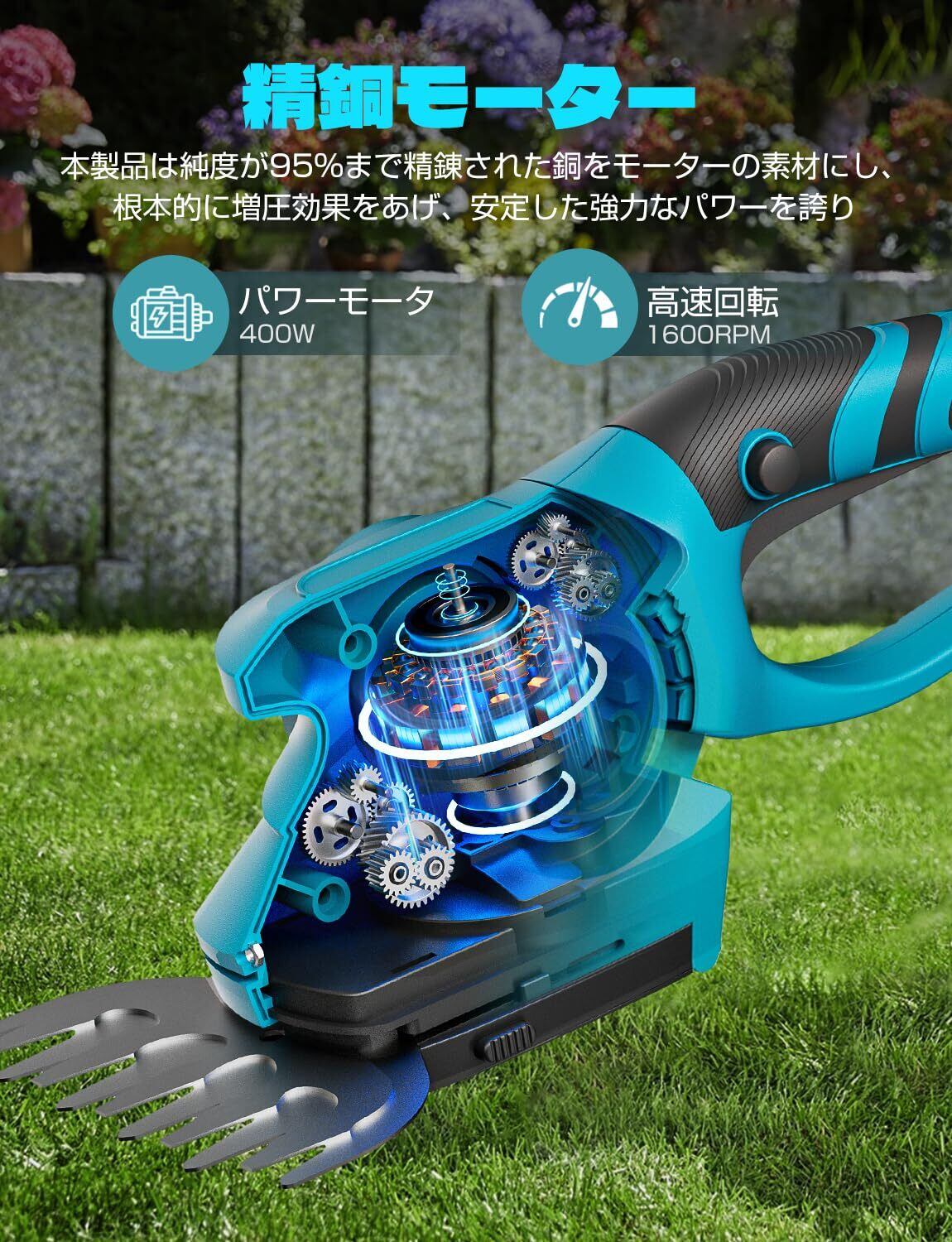 【精銅モーター&強力パワー】充電式芝生バリカンは純度が95%まで精錬された銅をモーターの素材にし、回転数は1600回転/分、根本的に増圧効果をあげ、安定した強力なパワーを誇り。