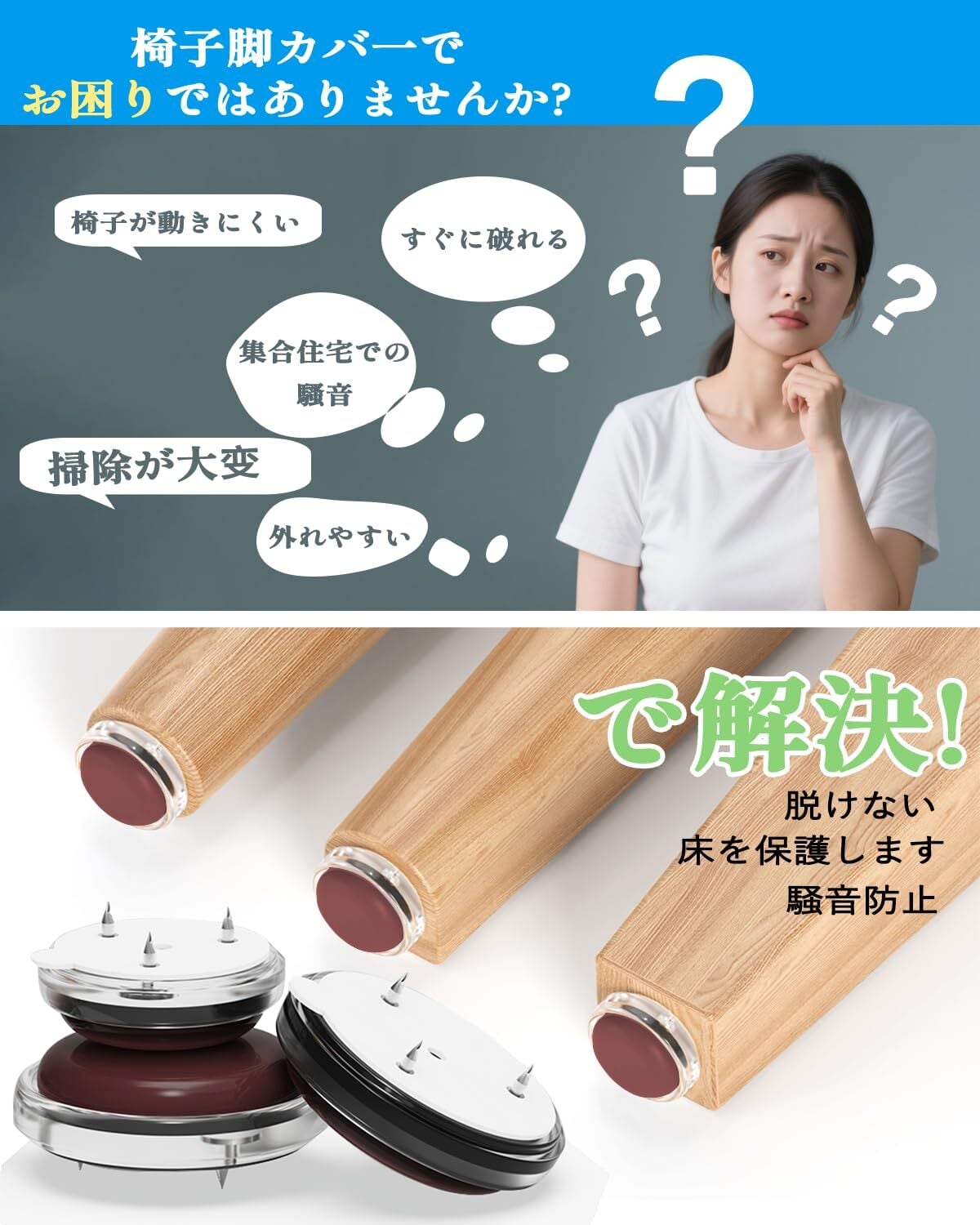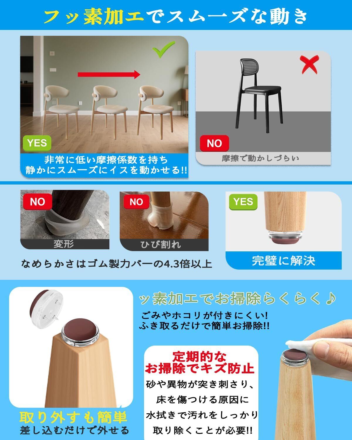 【2025 新型 木製椅子脚カバー】改良テフロン 材質を採用、滑らかさ 4.3 倍・耐摩耗性 1.9 倍向上。接触面に柔軟 TPE エラストマーを使用し、床の傷・衝撃音防止。※木製脚のみ対応。金属脚 / 非水平脚等使用不可。特許登録済み(特許番号:3250438)