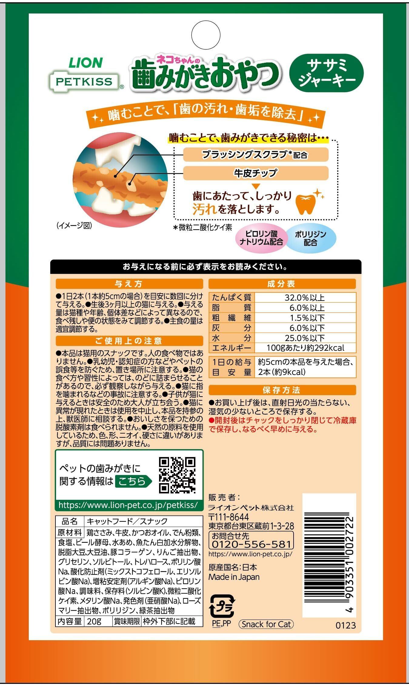 ライオン ペットキッス PETKISS ネコちゃんの歯みがきおやつ ササミジャーキー 20g×4個まとめ買い LIONPET