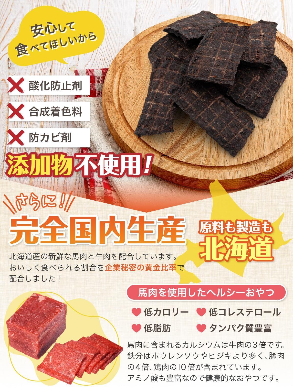 新鮮な北海道産牛肉と馬肉を使用し、無添加・無着色の安心安全な馬肉と牛肉をミックスした愛犬のおやつです。躾のご褒美や食欲のない時に与えて下さい。