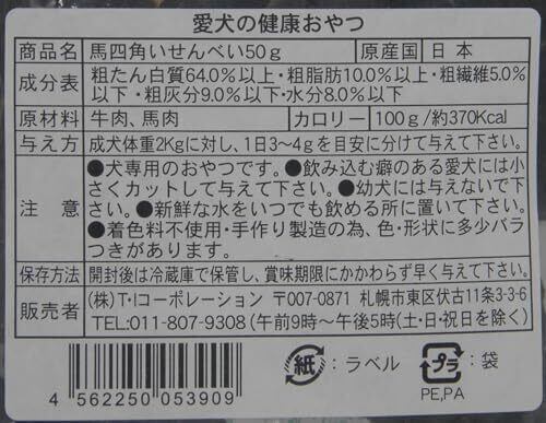 【人気商品】【北 海 道 直 送】 馬四角いせんべい ペットフード 犬用おやつ 国内製造 無添加 無着色 じっくり旨味乾燥 愛犬のおやつ 馬肉 犬 2P (50g×2)