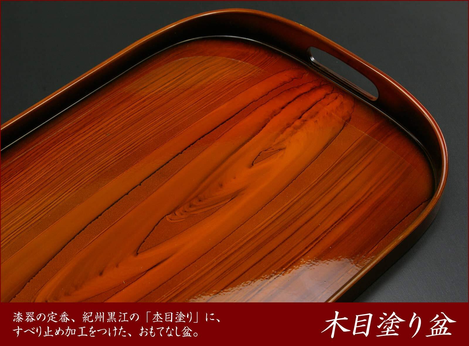 漆器の定番、紀州黒江の「杢目塗り」に、すべり止め加工をつけた、おもてなし盆。お客様へのお茶出しなどにピッタリです。 ・「日本三大漆器」に数えられる、「紀州漆器」の伝統ある技術で育まれた逸品は、使い込む程に愛着が湧いてきます。・漆器という伝統工芸を、今という時代に融合させた暮らしに寄り添う漆器です。