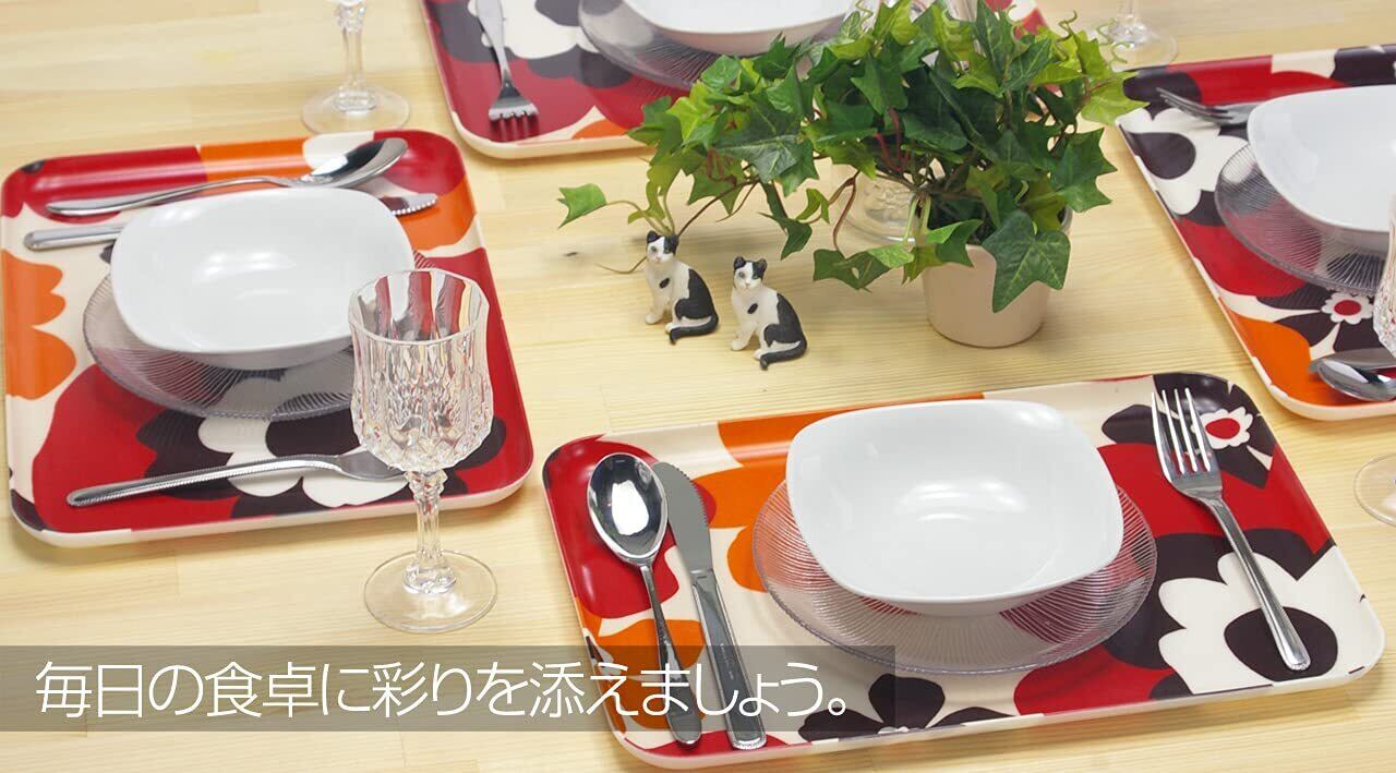 おしゃれ心いっぱいのテキスタイルと、耐水性に優れ、食品衛生法にも合致した安全な樹脂と塗料で作ったテキスタイルトレイ。 ●持ち手部分を省く事により、トレーの隅々まで使えるようにデザインされたスクエアタイプのトレー。トレーとしてだけでは無く、お料理と一緒にレンジで暖めた後はテーブルまで運んでランチョンマットとしてもご利用頂けます。 ●同じ柄の別サイズのトレーもございます。お揃いで揃えればお食事の時間がもっと楽しくなります。 ●テキスタイル(布地)ならでの風合いをそのままに、機能性を追求したトレーです。 ●「日本三大漆器」に数えられる、お盆の産地「紀州漆器(和歌山県海南市)」の技術で作られた、日本製の製品です。