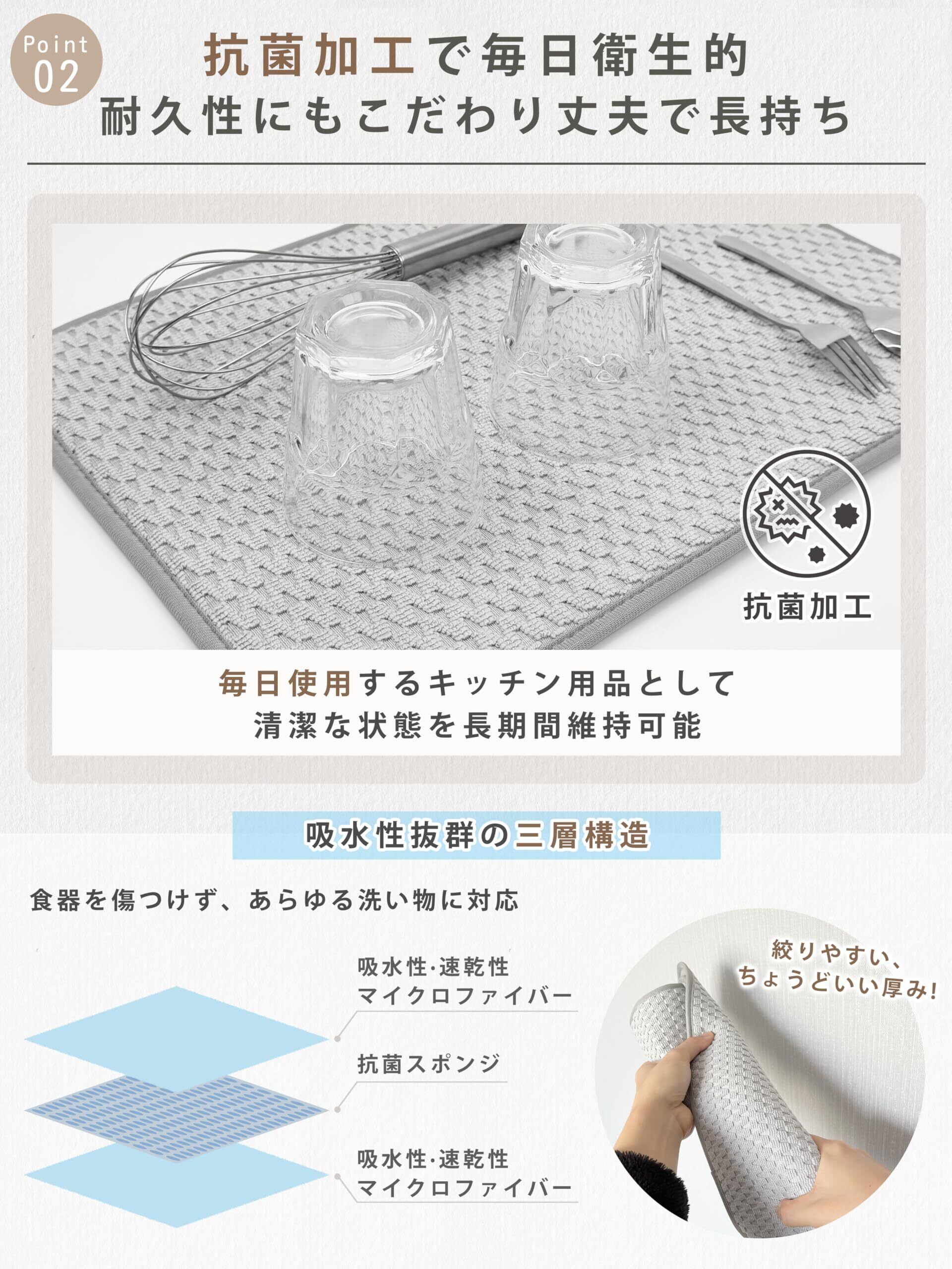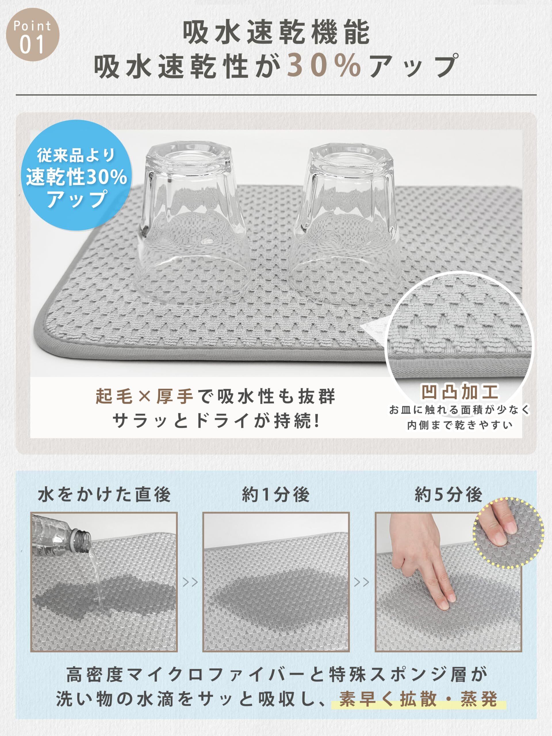 ✨【吸水と速乾のW機能で食器乾燥を効率化】高密度マイクロファイバーが水滴をサッと吸水。特殊な凹凸構造が水分を素早く拡散させ、食器とマット自体の速乾を促します