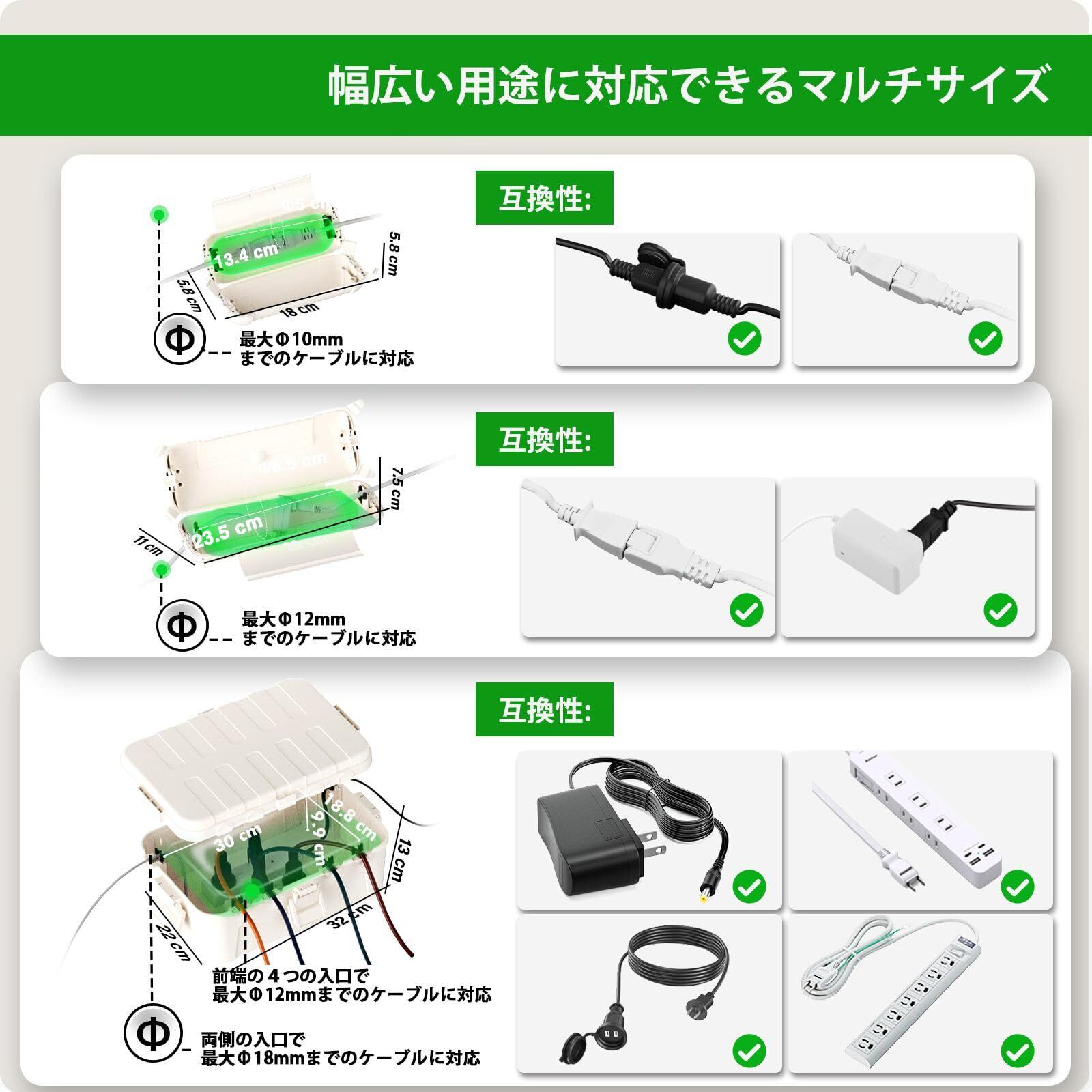 延長コード安全カバー: ロック ラッチx4、ケーブルクランプx2、取り付け穴x2、ケーブルタイx2、防水性と密閉性を確保し、屋外と屋内の電気接続を乾燥させて安全に保ちます。どこにでも簡単に設置して吊り下げられます。
